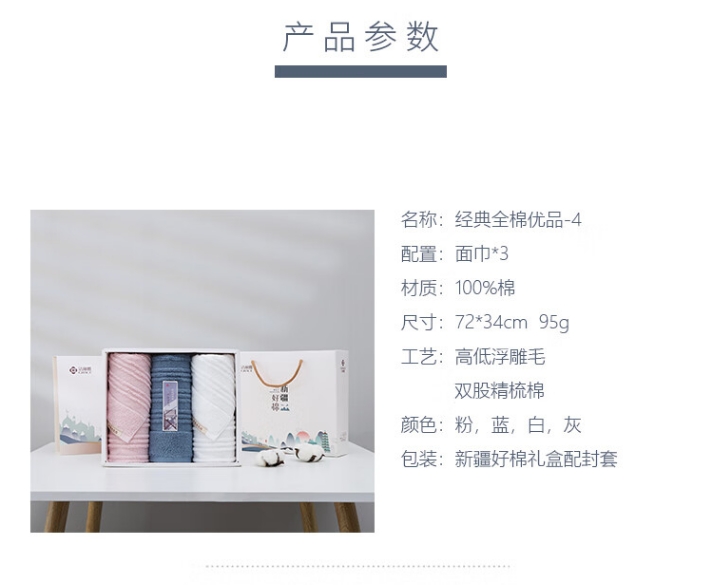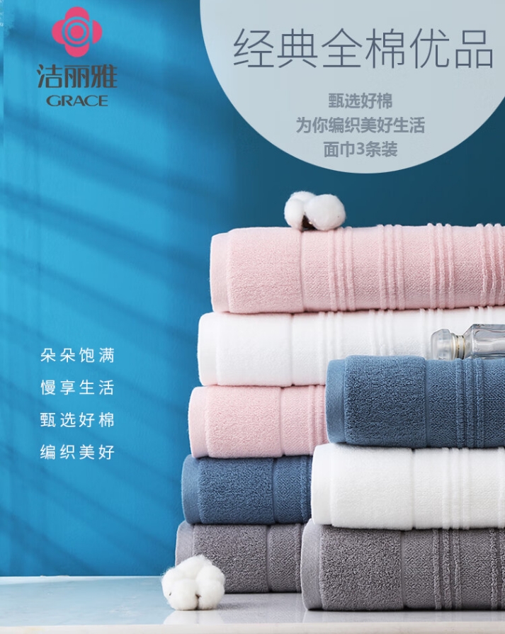 商品名称:洁丽雅 经典全棉优品-4 72*34cm 95g 面巾*3条 (颜色混发)