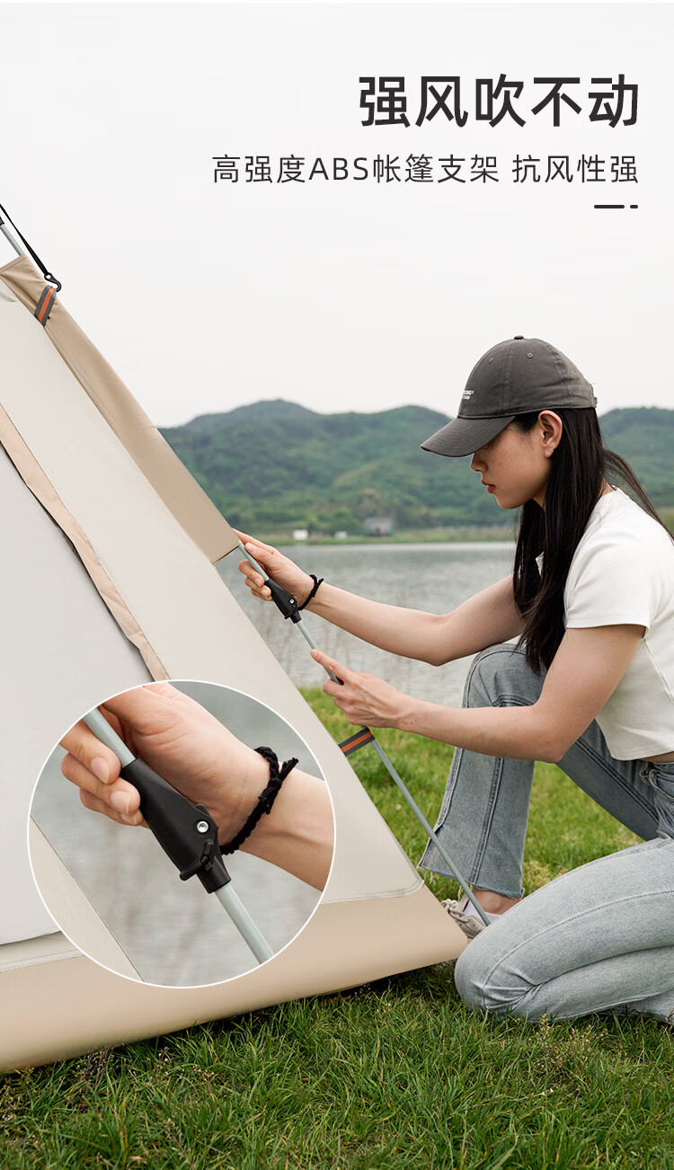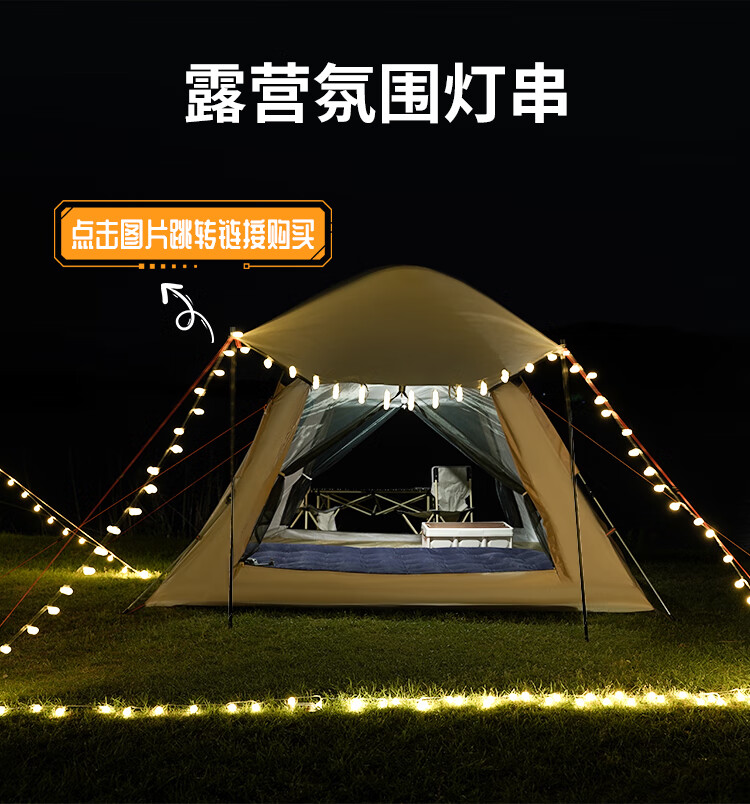 包装清单 :帐篷地钉6根,帐篷风绳6根, 门厅杆2根,天窗盖1个,天幕杆2根