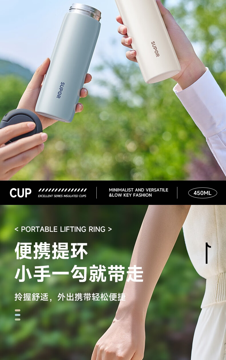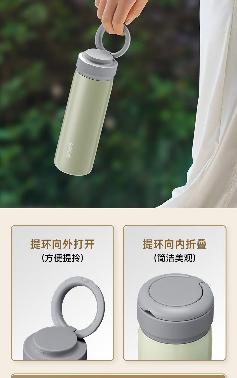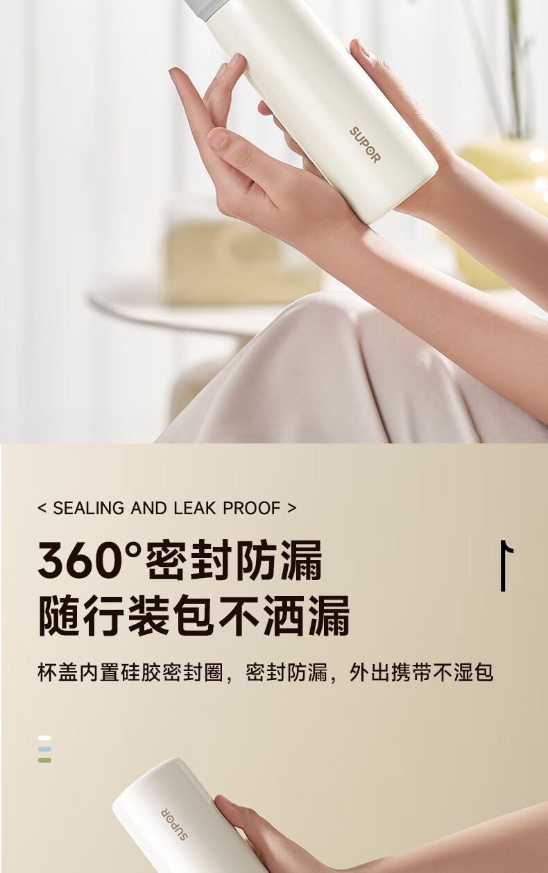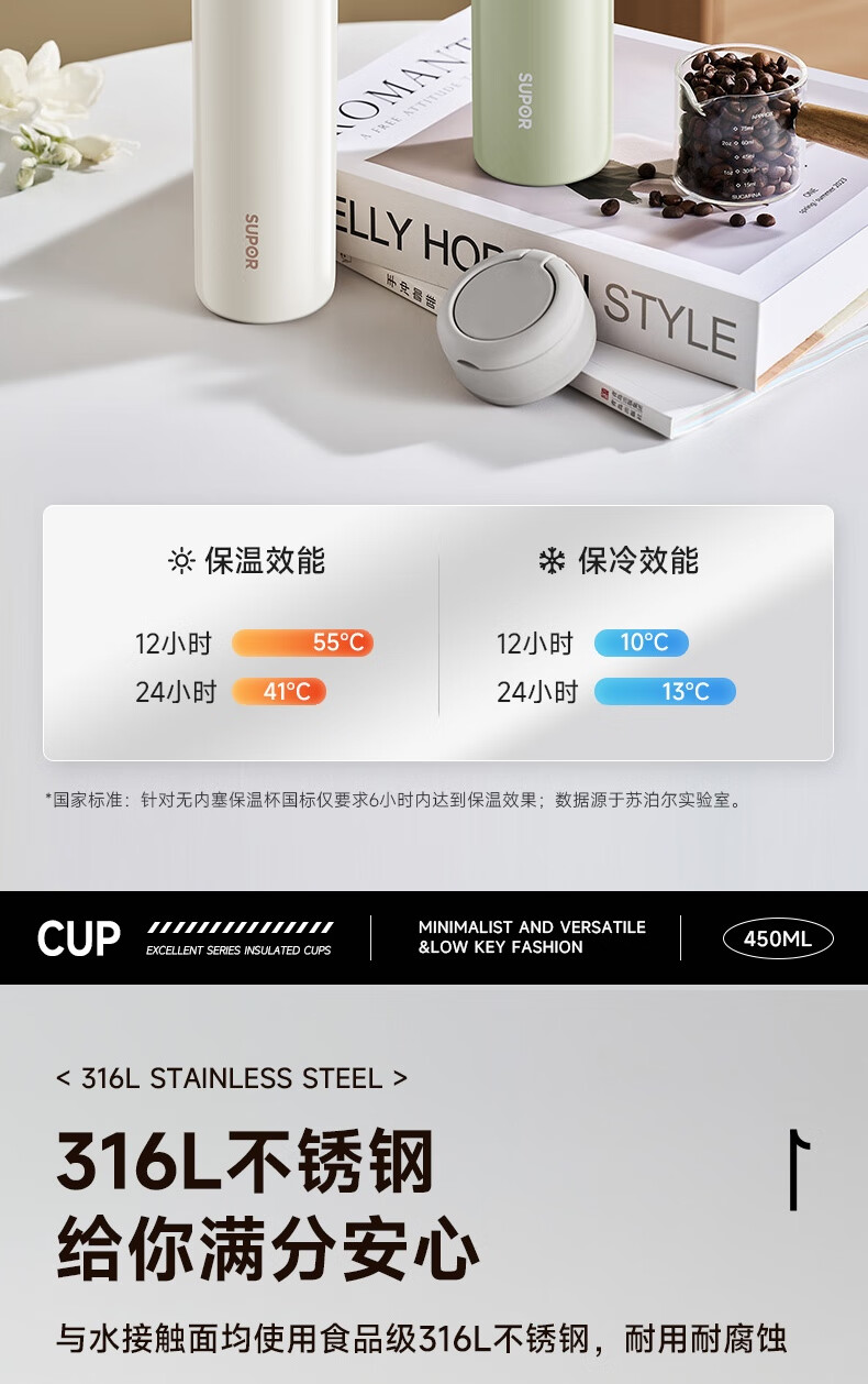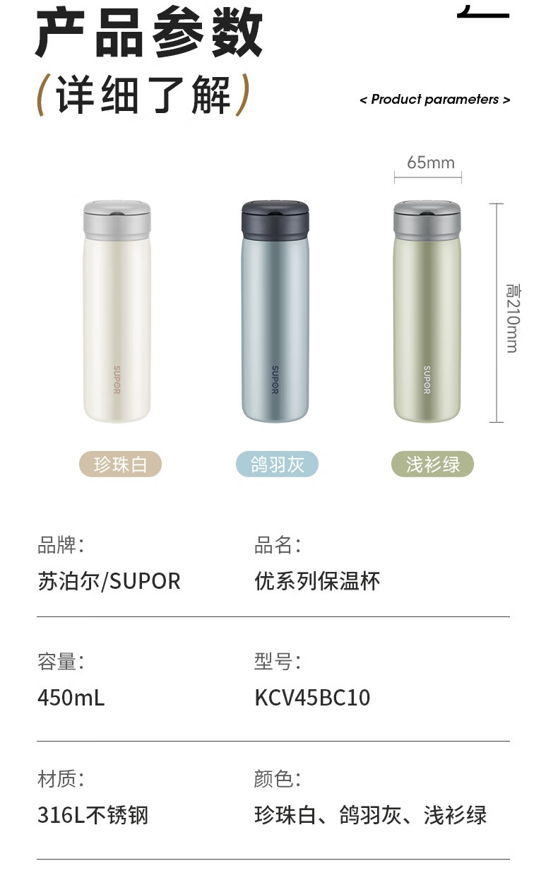苏泊尔保温杯保温杯316L不锈钢学生水杯子 450ml KCV45BC10(珍珠白)/KCV45BC11(鸽羽棕)/KCV45BC12(浅杉绿)