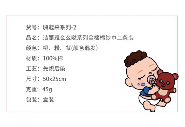 商品名称:洁丽雅 萌动-2 50*25cm 45g 么么哒童巾*2条