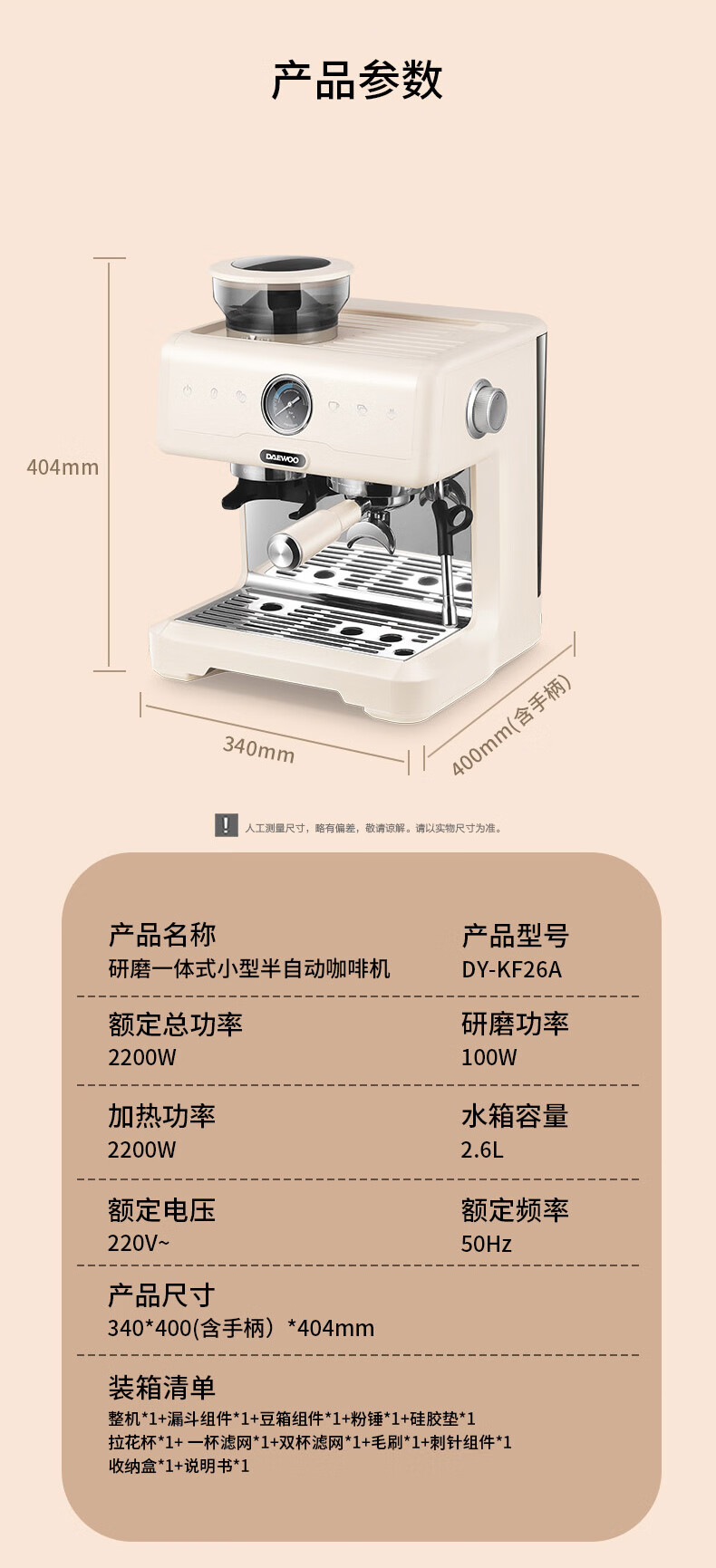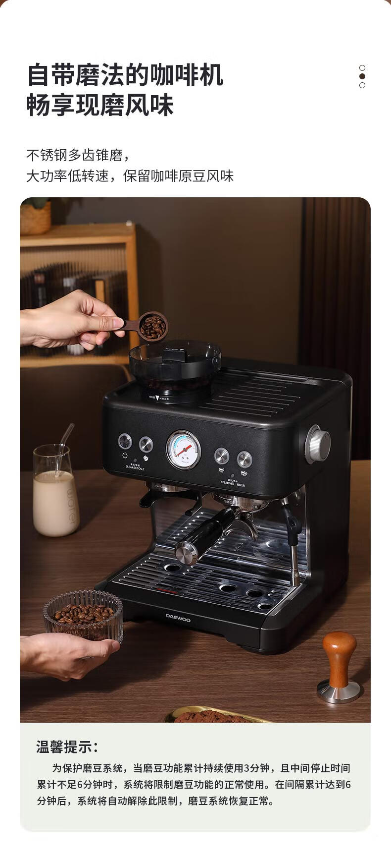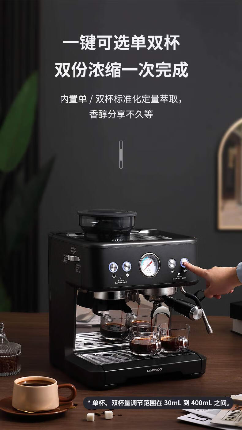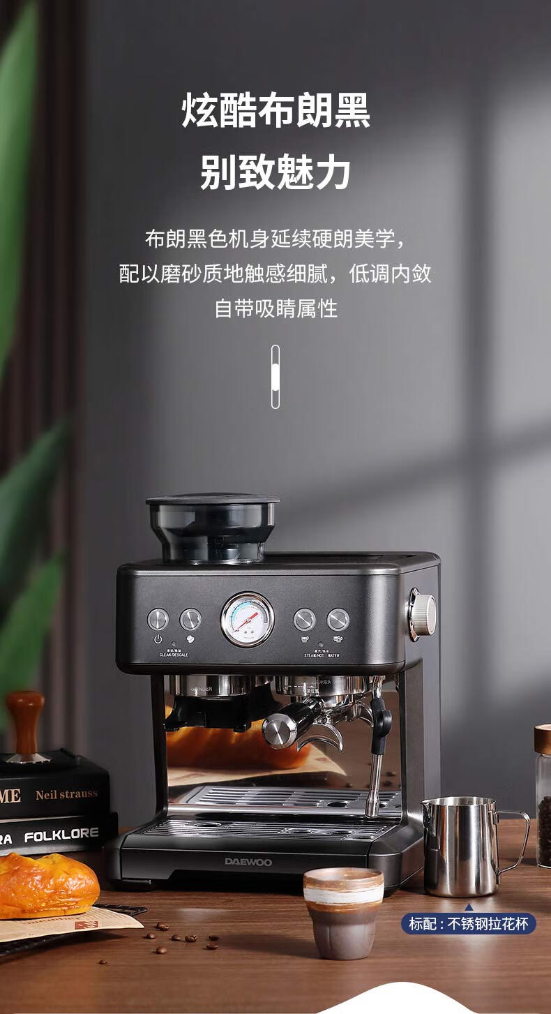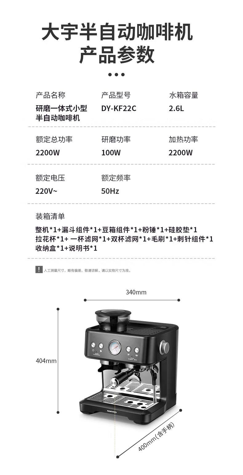 商品名称:大宇(DAEWOO) 研磨一体式小型半自动咖啡机 2200W DY-KF22C(布朗黑)/DY-KF26A(科洛白)