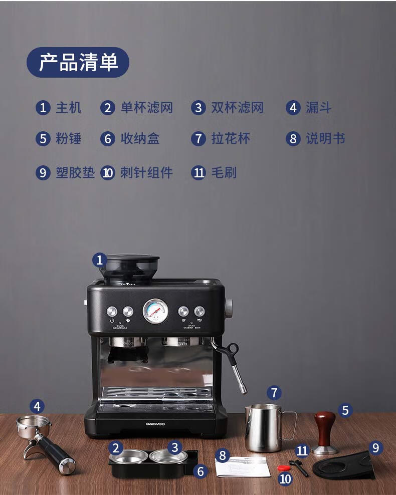 整机/漏斗组件/豆箱组件/粉锤/硅胶垫/拉花杯/一杯滤网/双杯滤网/ 毛刷/刺针组件/收纳盒/接粉器/说明书