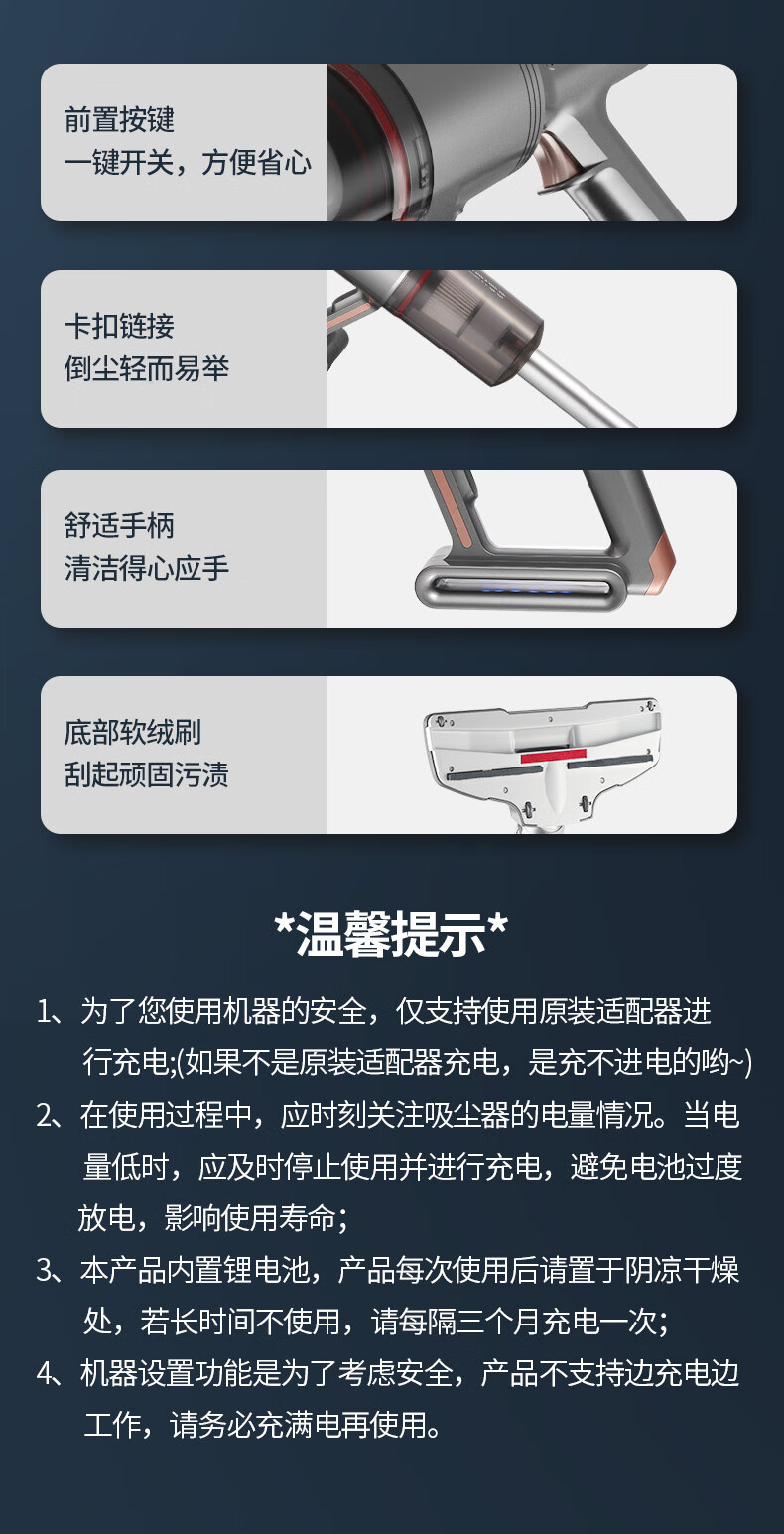 商品清单 :主机/地刷/扁吸刷/伸缩管/ 电源适配器/挂架/螺丝包/说明书