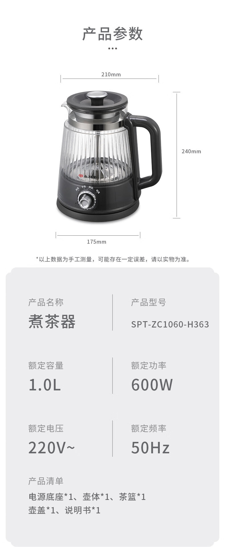电源底座/壶体/茶篮/ 壶盖/说明书