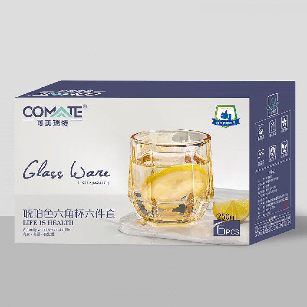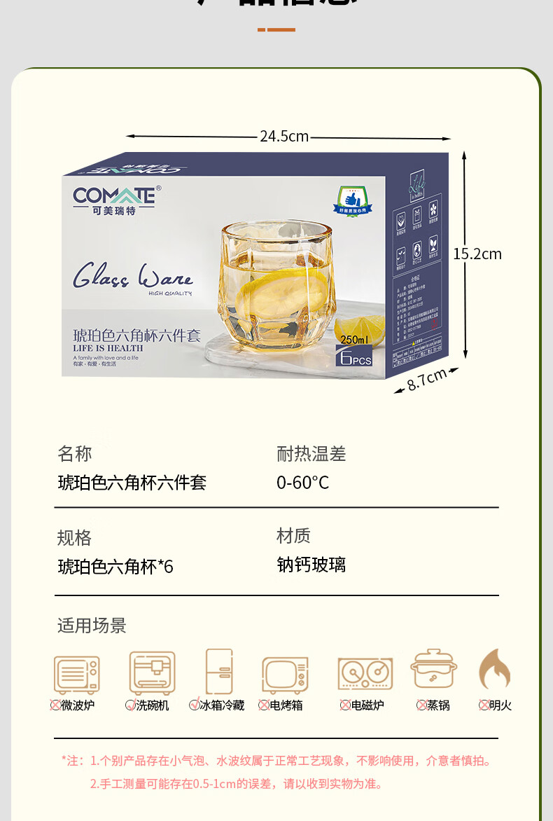 商品名称:可美瑞特(COMATE)琥珀色六角杯六件套 杯250ml*6 YTHPLJB/L6