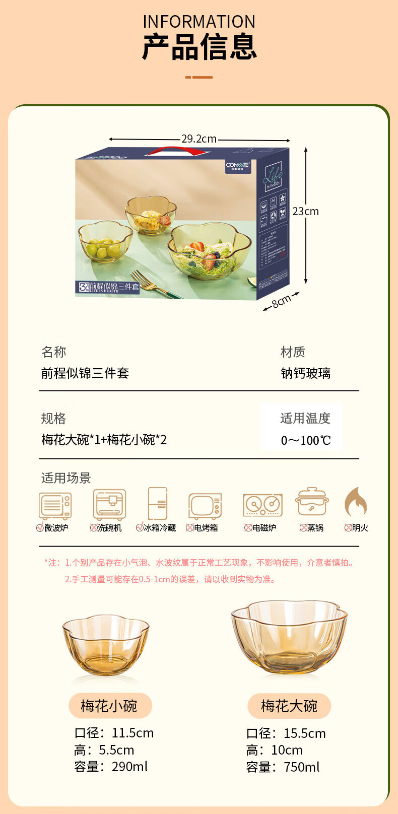 商品名称:可美瑞特(COMATE) 前程似锦三件套 小碗290ml*2+大碗750ml*1 YTQCSJ/L3