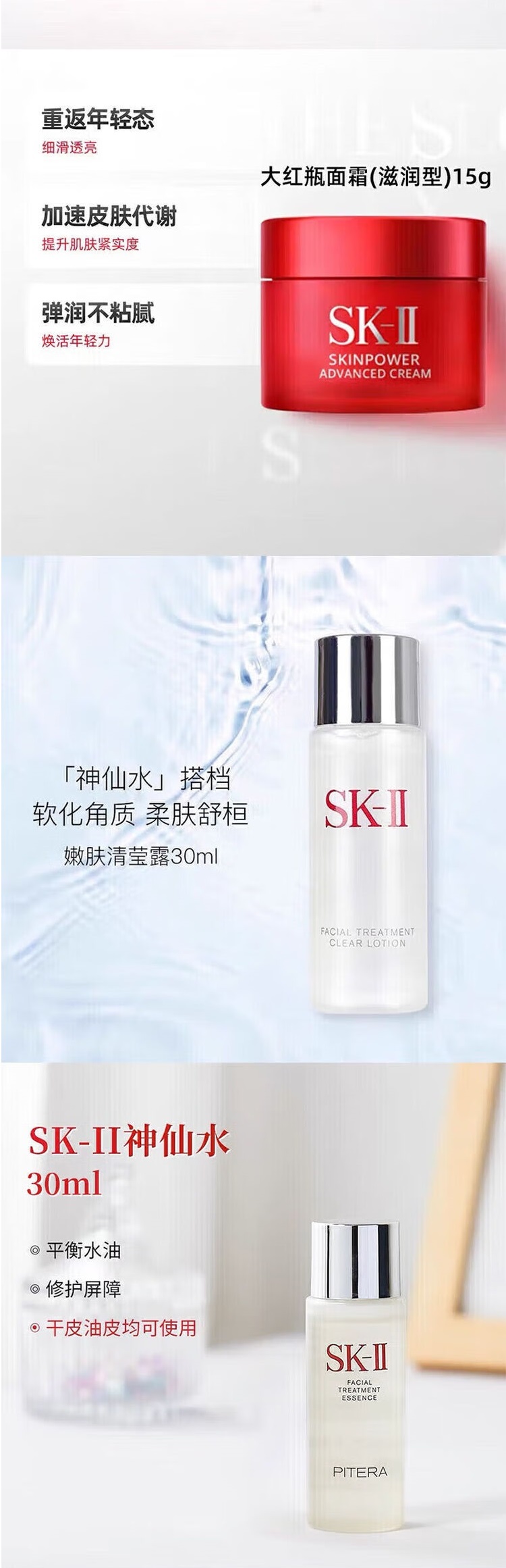 商品名称:SK-II 护肤精华露230ml(神仙水) 赋能焕彩精华霜80g(大红瓶) 赋能焕彩精华露50ml(小红瓶)