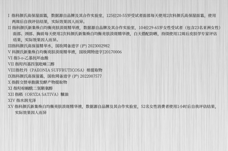 包装清单(套装) :高保湿精华爽肤水250ml(高保水) 高保湿面霜50ml(小高保) 新集焕白均衡亮肤淡斑精华液50ml