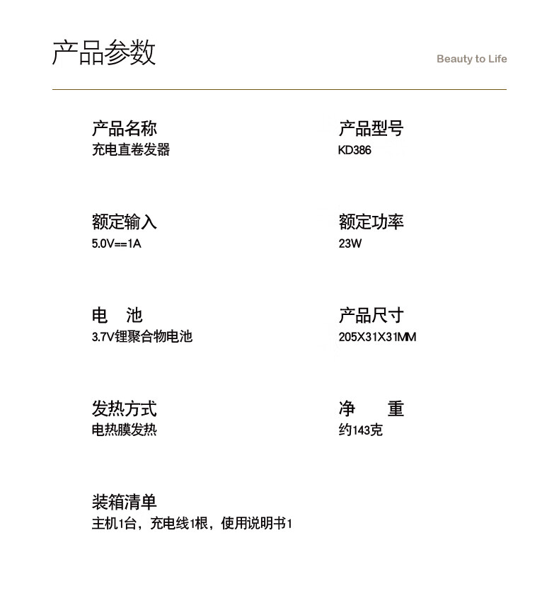 商品名称:金稻 卷直发棒(充电款)KD386 8W