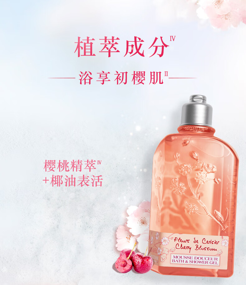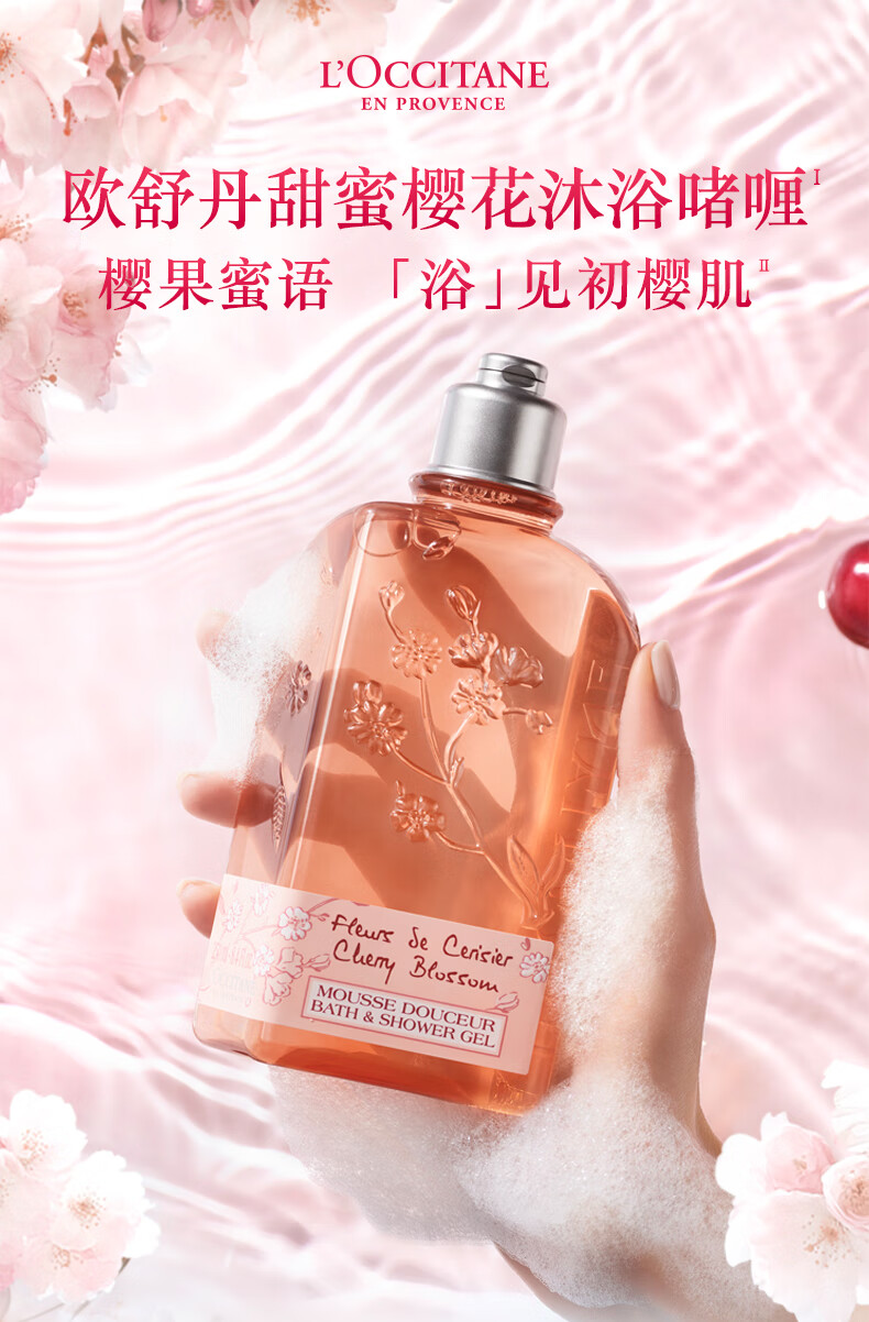 包装清单(套装) :欧舒丹甜蜜樱花沐浴啫喱250ml +草本修护洗发露300ml +草本修护护发素250ml