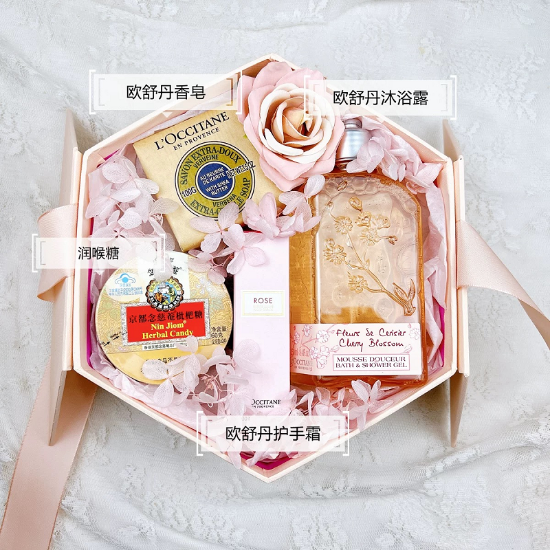 包装清单(套装) :欧舒丹润手霜30ml +樱花沐浴啫喱250ml +香皂100g+ 润喉糖
