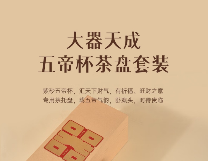 配置清单 :① 黑星·水·顺治杯(65ml)×1只 ② 绿泥·木·康熙杯(65ml)×1只 ③ 段泥·土·雍正杯(65ml)×1只 ④ 甲泥·金·乾隆杯(65ml)×1只 ⑤ 红泥·火·嘉庆杯(65ml)×1只 ⑥ 大器专用茶盘×1只 ⑦ 经典竖式包装×1套 ⑧ 心意手袋×1只