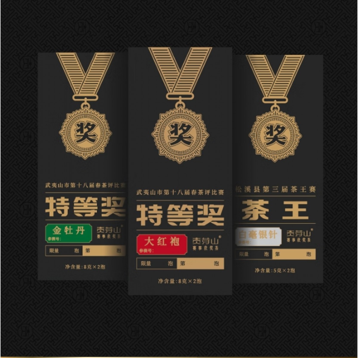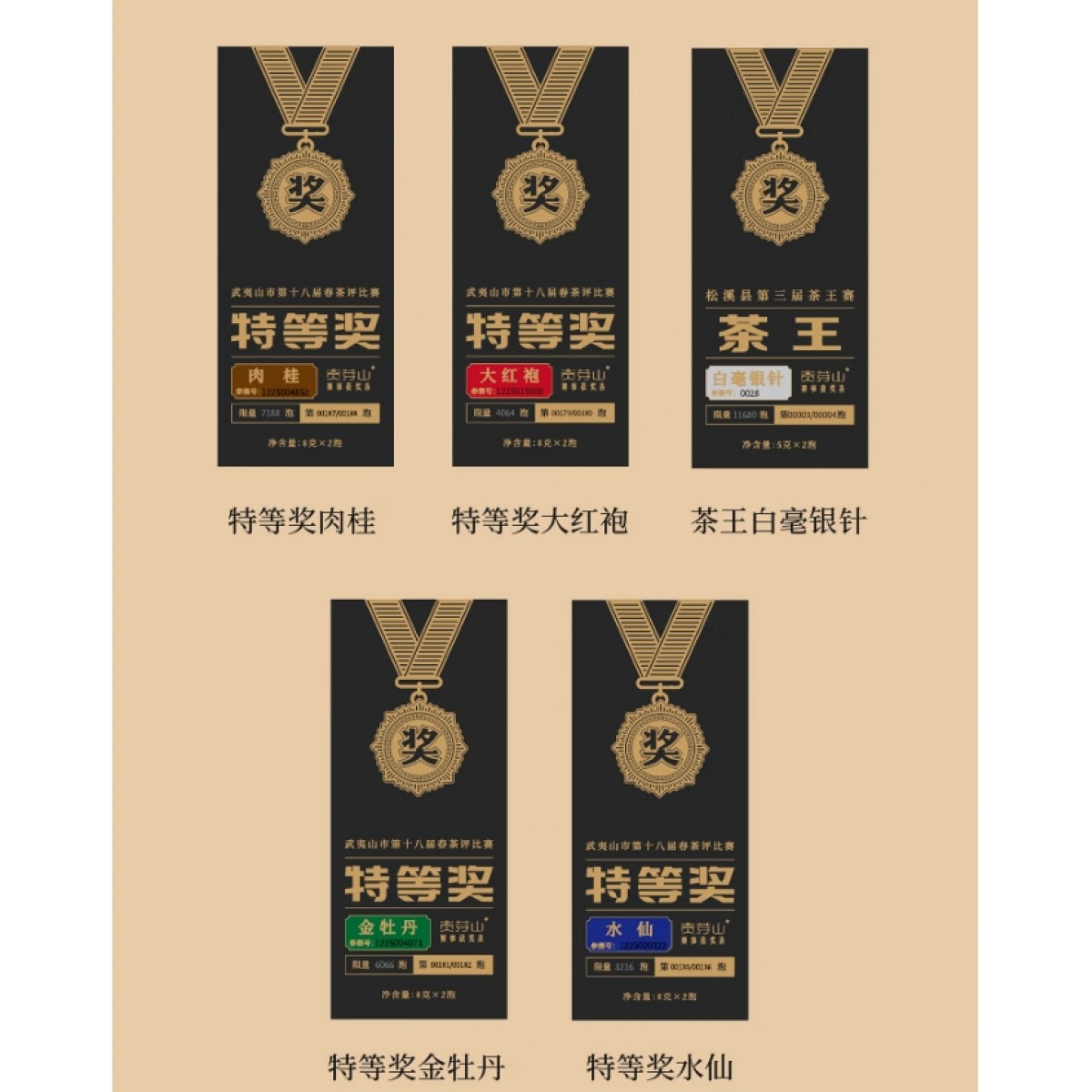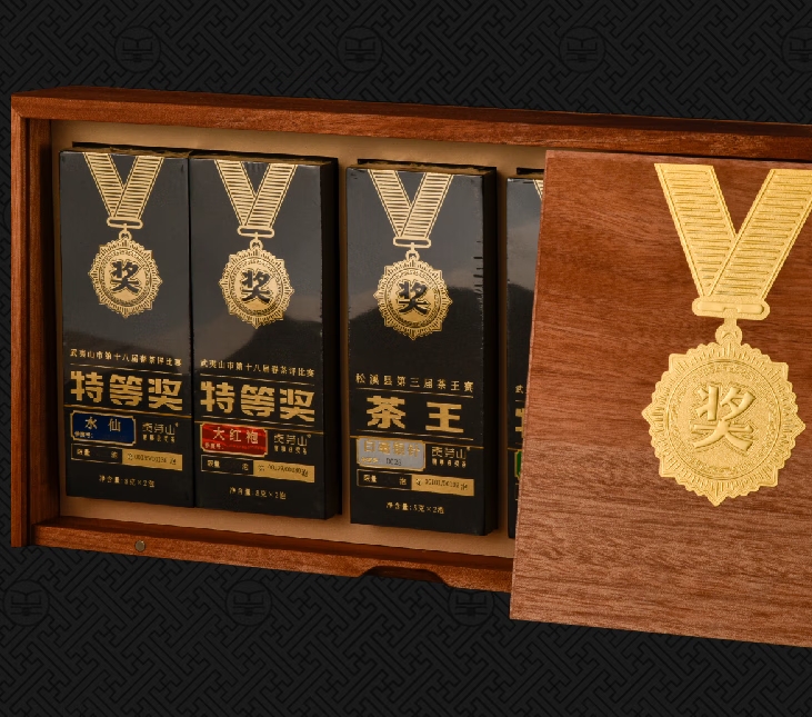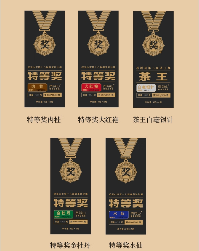①茶王白毫银针5克×2泡 丨 ② 特等奖水仙8克×2泡 ③ 特等奖大红袍8克×2泡丨 ④特等奖肉桂8克×2泡 ⑤特等奖金牡丹8克×2泡 丨 ⑥精致礼盒 ×1套
