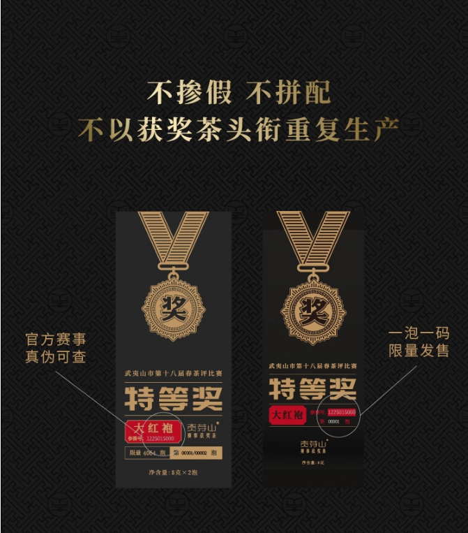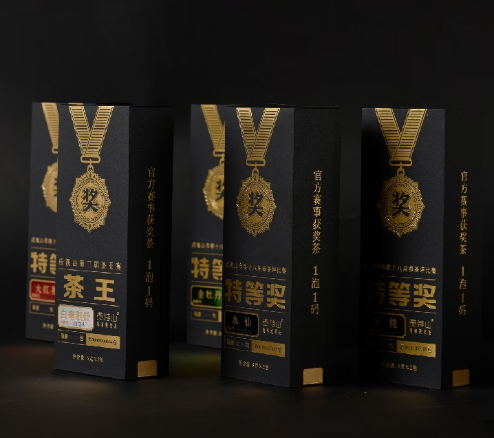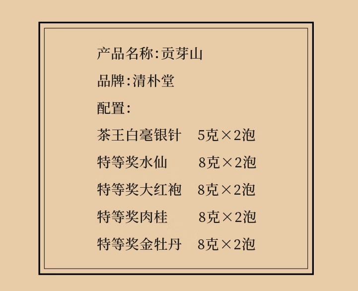 包装清单 :①茶王白毫银针5克×2泡 丨 ② 特等奖水仙8克×2泡 ③ 特等奖大红袍8克×2泡丨 ④特等奖肉桂8克×2泡 ⑤特等奖金牡丹8克×2泡 丨 ⑥精致礼盒 ×1套