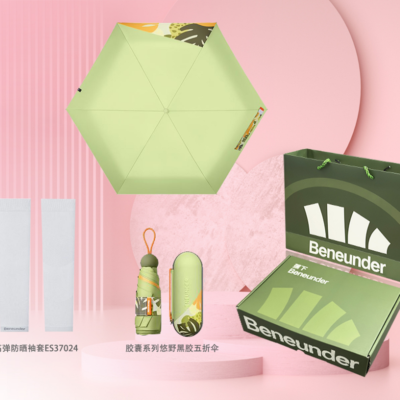 包装清单 :胶囊系列悠野黑胶五折伞*1+高弹防晒袖套ES37024*1+蕉下定制礼盒礼袋套装*1盒礼袋套装*1