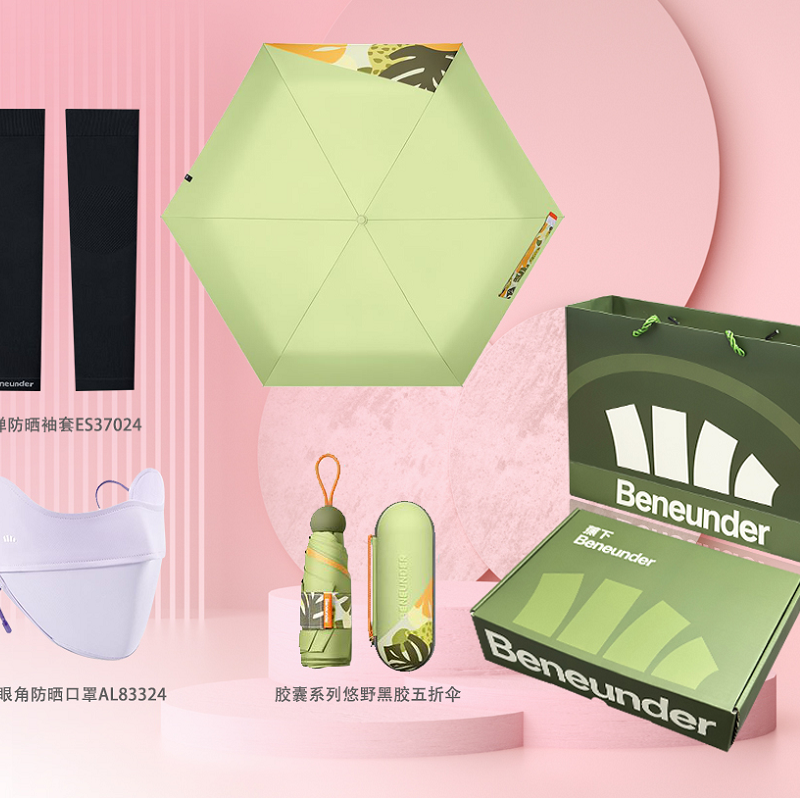 包装清单 :胶囊系列悠野黑胶五折伞*1+凉感护眼角防晒口罩AL83324*1 +高弹防晒袖套ES37024*1+蕉下定制礼盒礼袋套装*1