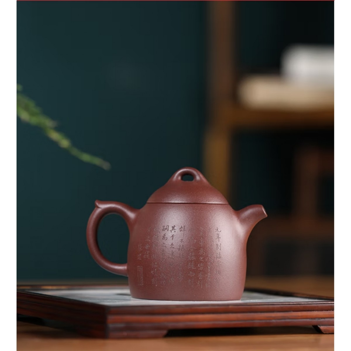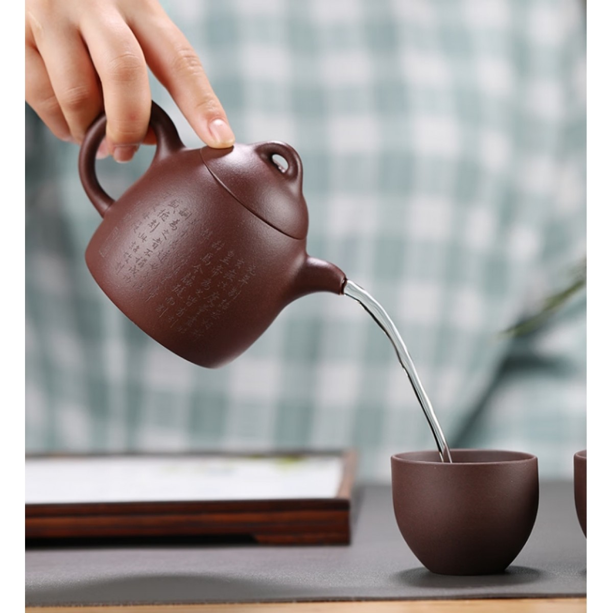 包装清单 :①紫泥大秦权壶 ×1把 ②紫泥林权杯 ×6只 ③PU海棠形桌席 ×1张 ④实木挂画(秦石权拓本) ×1幅 ⑤精致礼盒 ×1套