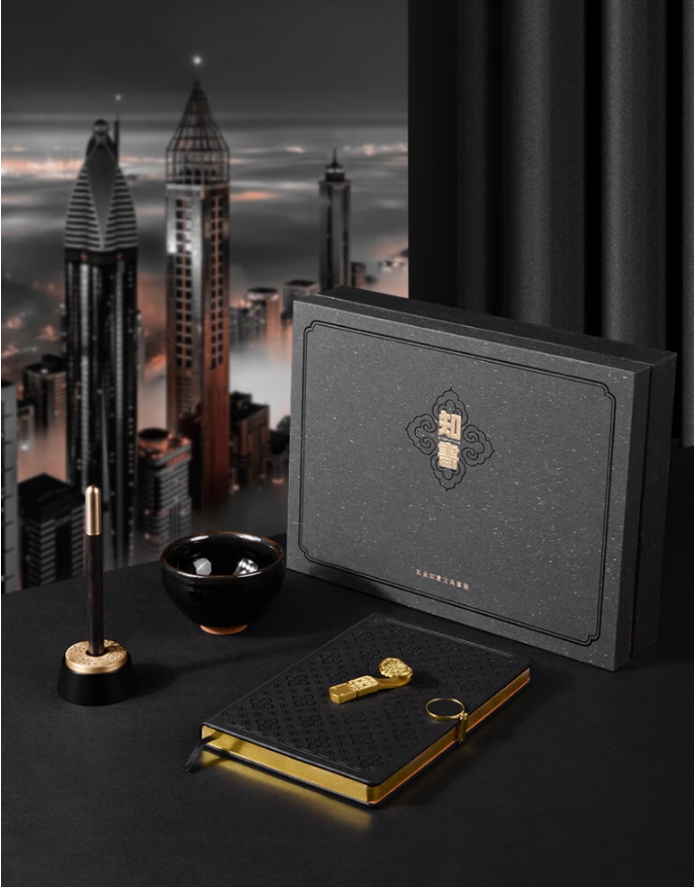 包装清单 :① 玄金如意笔(黑檀)×1支 ② 如意笔记本×1本 ③ 乌金建盏主人杯×1个 ④ 如意优盘32g×1个 ⑤ 玄金如意旋转笔插×1个 ⑥ 精美礼盒×1个 ⑦ 心意手袋×1只