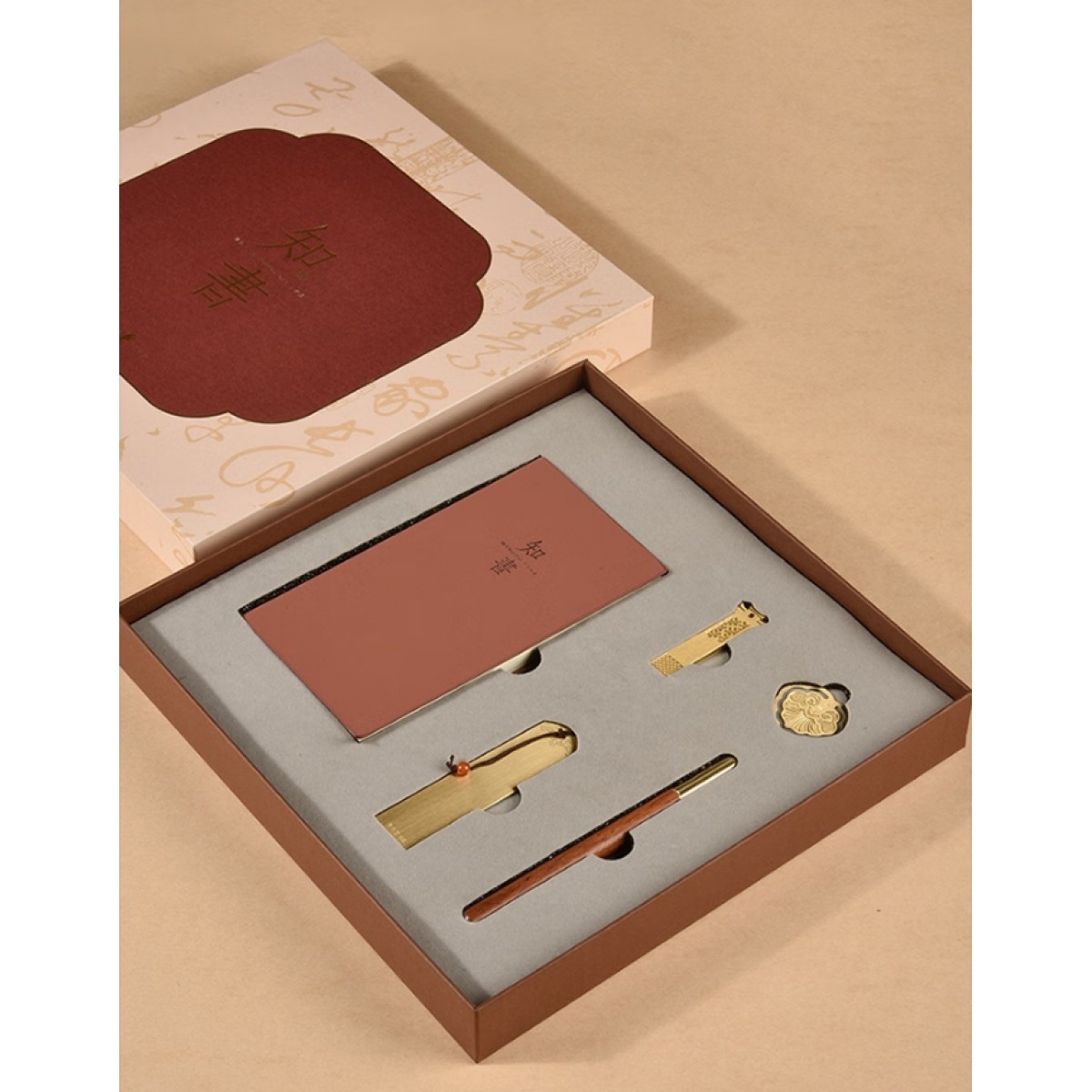 ①知书红木笔×1支 ②黄铜书签 ×1枚 ③知书记事本×1本 ④如意铜书扣×1枚 ⑤黄铜U盘×1个 ⑥精美礼盒×1个 ⑦心意手袋×1只