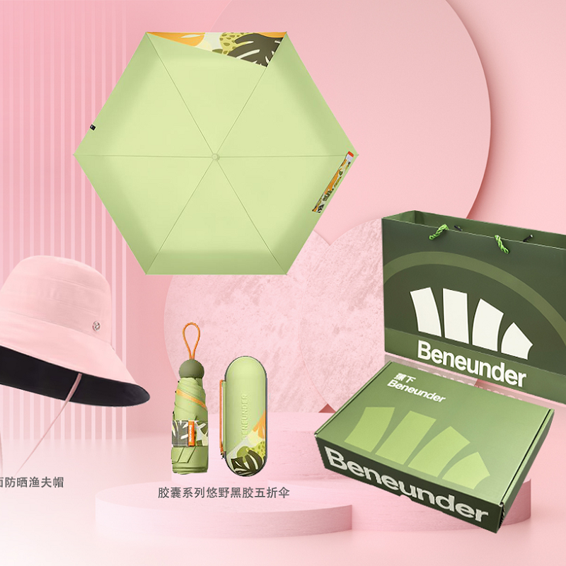 包装清单 :胶囊系列悠野黑胶五折伞*1+双面防晒渔夫帽*1+蕉下定制礼盒礼袋套装*1