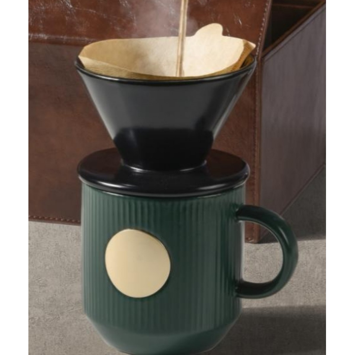 ① 手摇便携磨豆器×1套 ② 手冲咖啡陶瓷滤杯×1只 ③ 陶瓷勋章咖啡杯×1只 ④ 咖啡专用滤纸×1包 ⑤ 商务派手提皮盒×1只