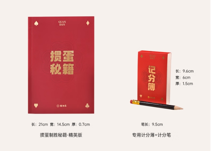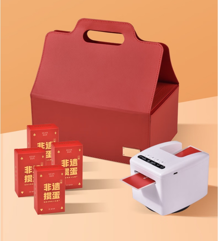 包装清单 :① 非遗主题掼蛋2副装-厚款×4套 ② 自动发牌器×1个 ③制胜秘籍-精英版×1本 ④ 非遗掼蛋-专用计分薄×1套 ⑤ 非遗掼蛋-计分专用铅笔×1支