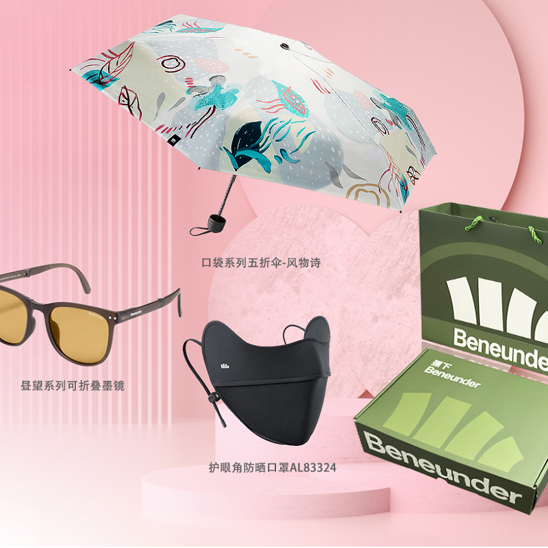 包装清单 :口袋系列五折伞风物诗*1+昼望系列可折叠墨镜*1 +凉感护眼角防晒口罩AL83324*1+蕉下定制礼盒礼袋套装*1