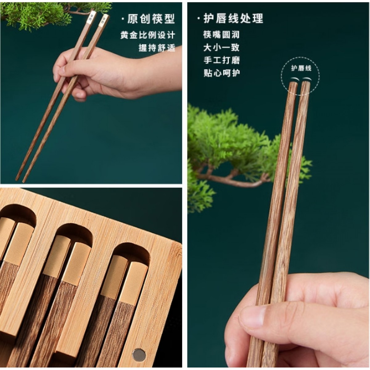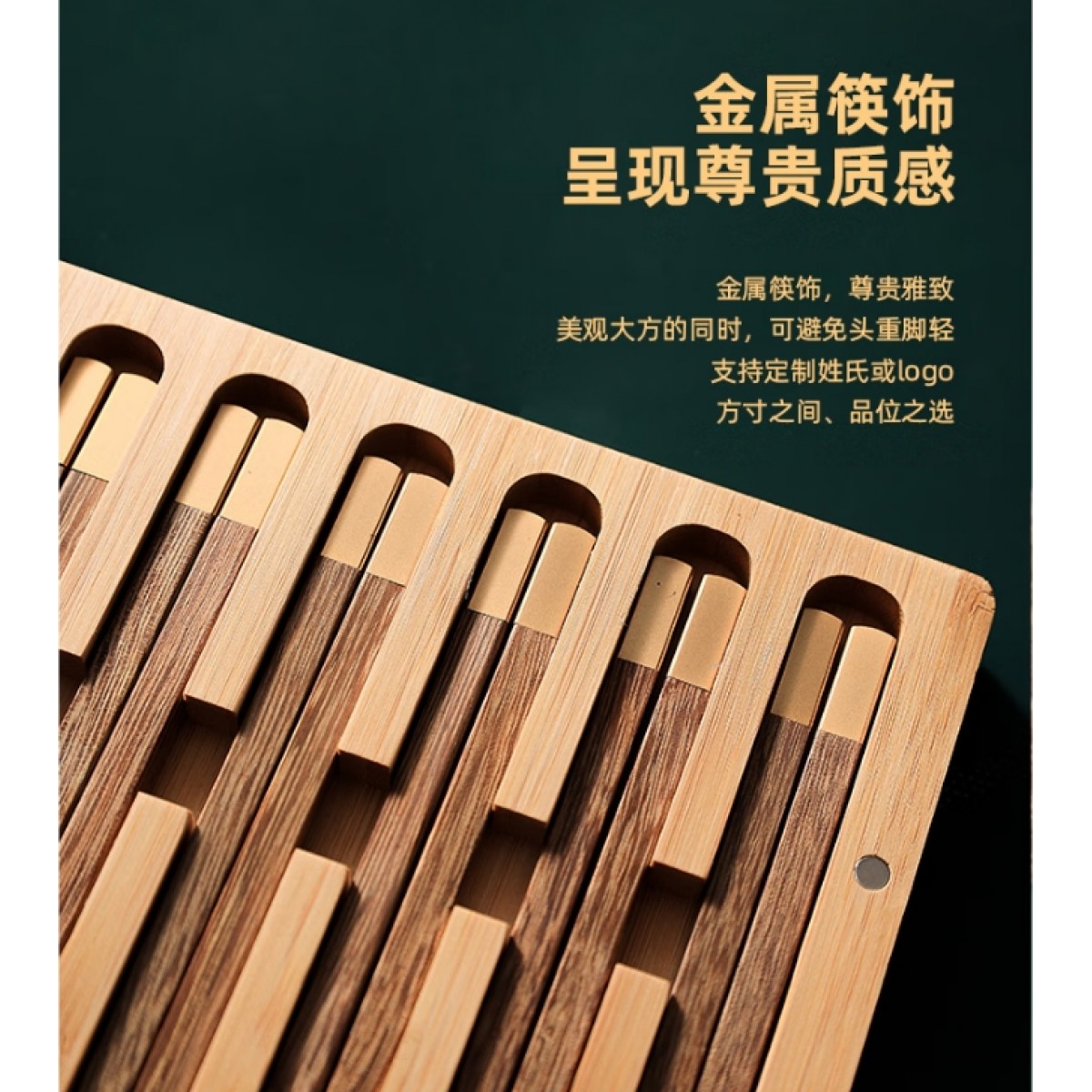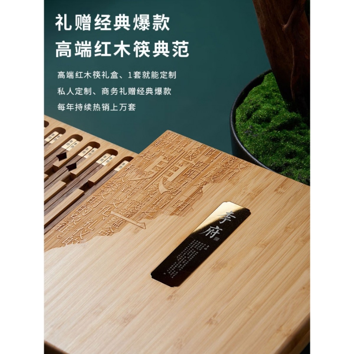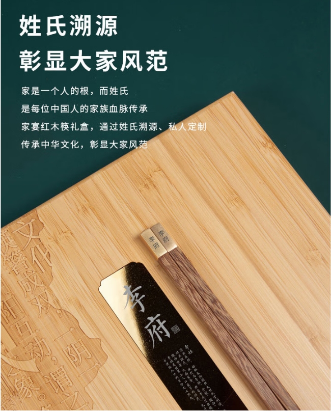 包装清单 :①鸡翅木方筷 ×10双 ②“姓氏”文化竹盒 ×1个 ③定制金属铭牌 ×1片 ④精致礼盒 ×1套