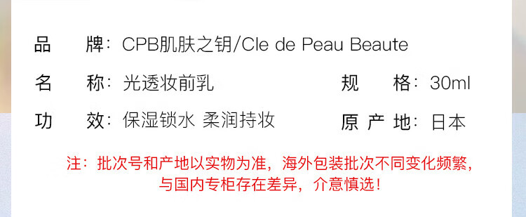 包装清单(套装) :肌肤之钥 光透妆前乳 SPF24. PA++ 30ml(黑短管隔离)