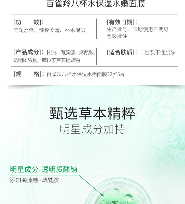 商品名称:百雀羚8杯水保湿水嫩面膜 5片