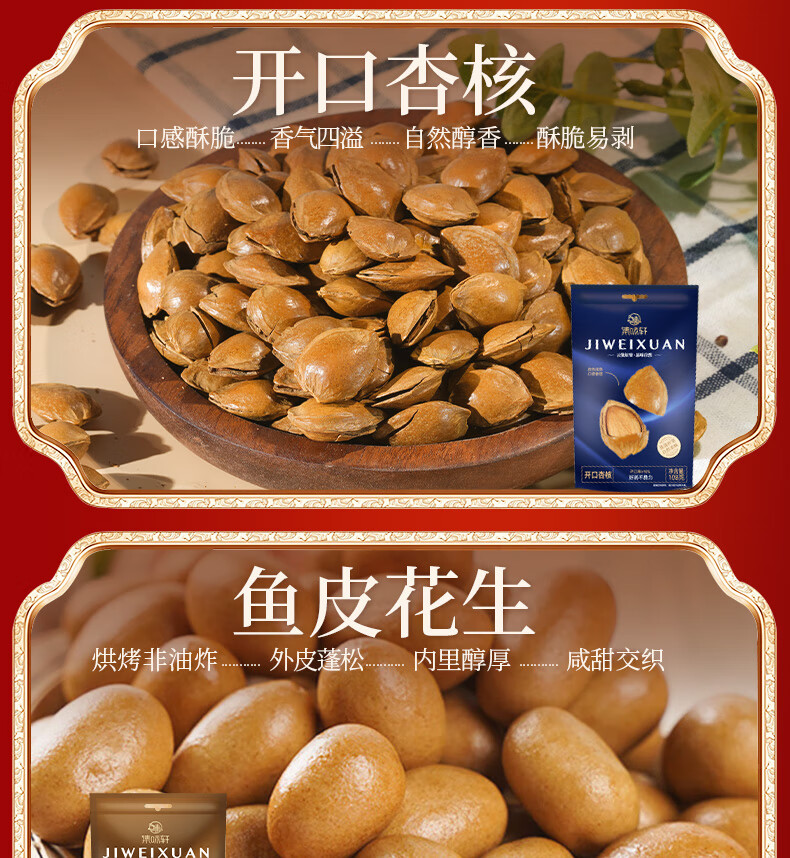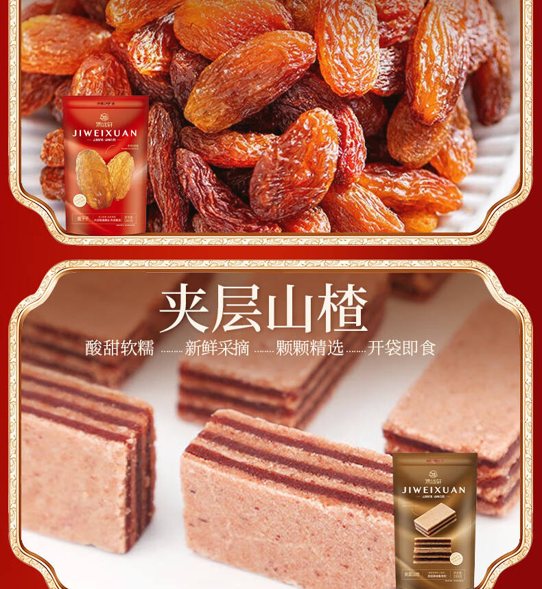 越南紫衣腰果108g 开口杏核108g 鱼皮花生288g 五香黑豆288g 智利提子干288g 夹层山楂288g