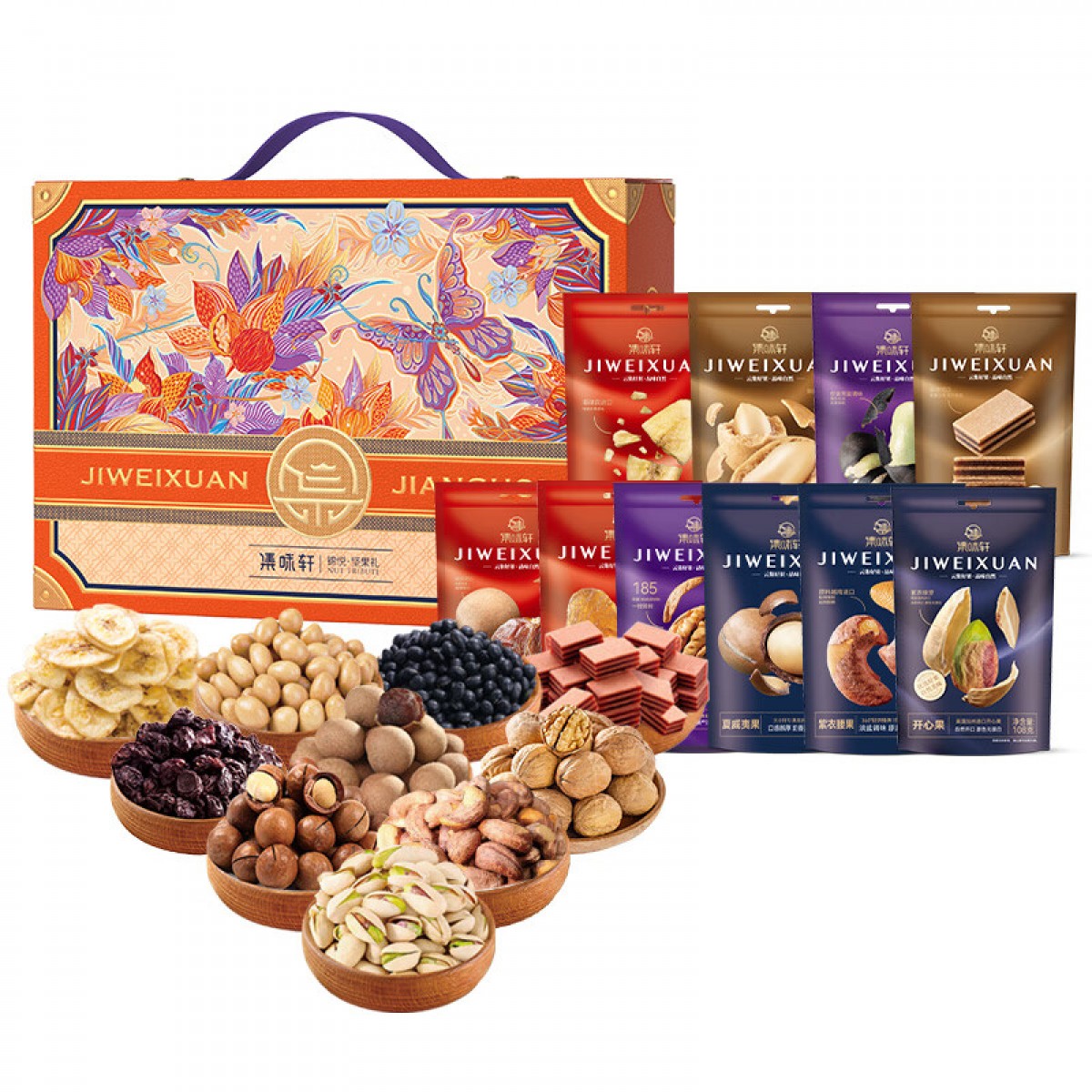 内含配置(含克重) :美国加州开心果108g 越南紫衣腰果108g 南非夏威夷果108g 新疆纸皮核桃188g 泰国龙眼干188g 智利提子干188g 夹层山楂288g 五香黑豆288g 鱼皮花生288g 菲律宾香蕉片288g