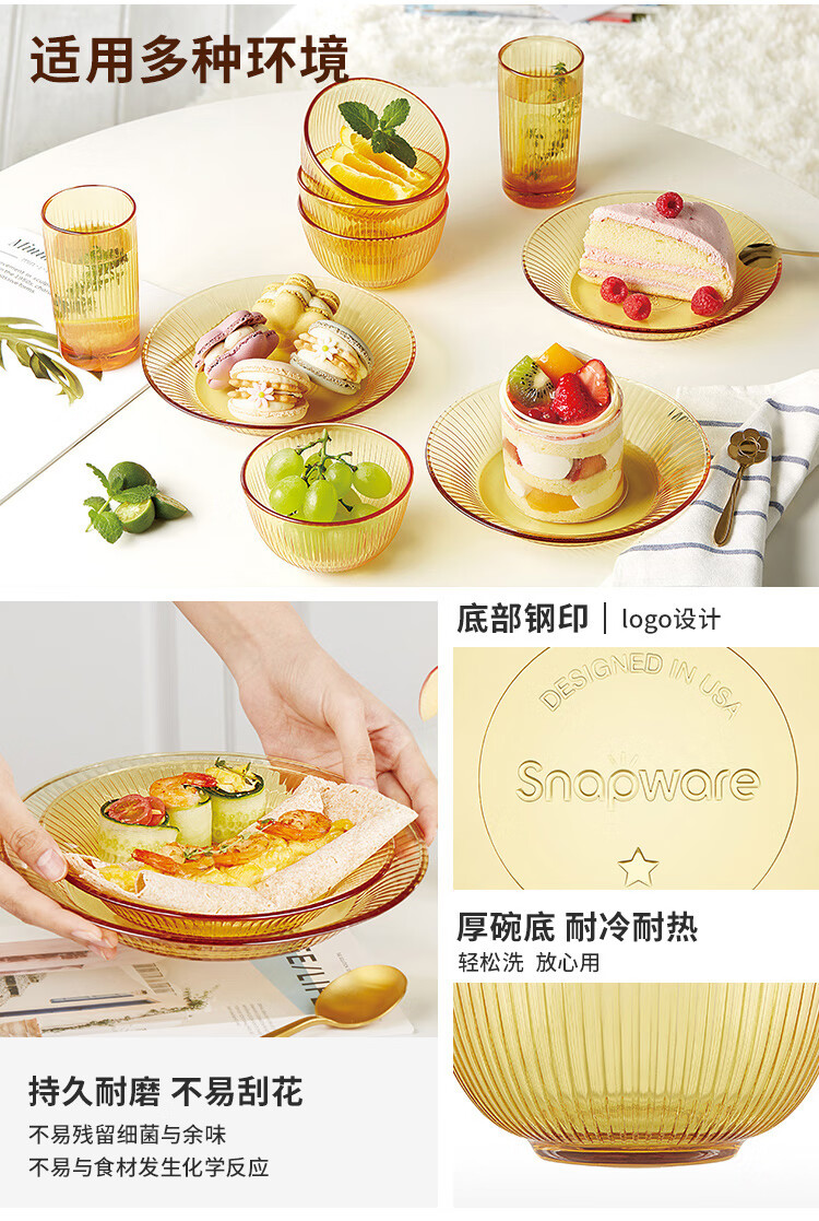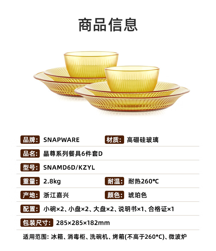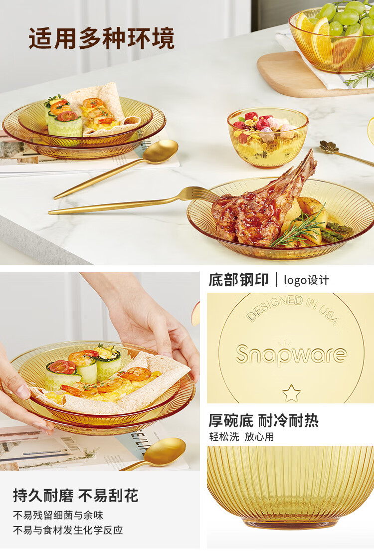 商品名称:康宁Snapware晶尊系列餐具6件组D 饭碗336ml 深盘453ml 浅盘665ml SNAMD6D/KZYL(黄盒)