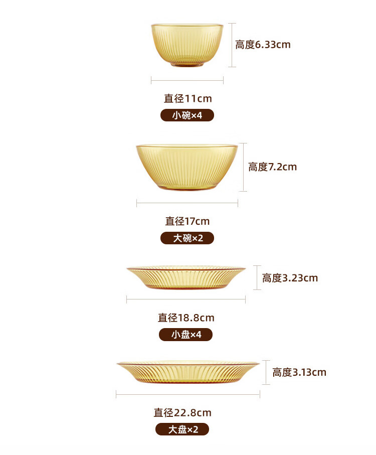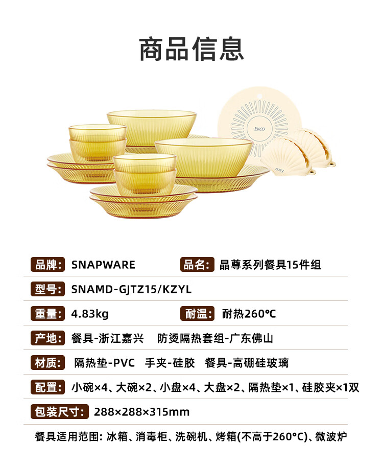 商品名称:康宁 Snapware晶尊系列餐具15件组 饭碗336ml 面碗800ml 深盘453ml 浅盘665ml SNAMD-GJTZ15/KZYL(黄盒)