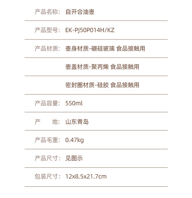 商品名称:康宁 EKCO自开合油壶 550ml EK-PJ50P014H/KZ