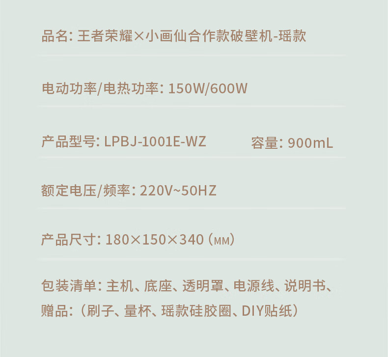 商品名称:小画仙 王者荣耀联名轻音破壁机 900ml LPBJ-1001E-WZ