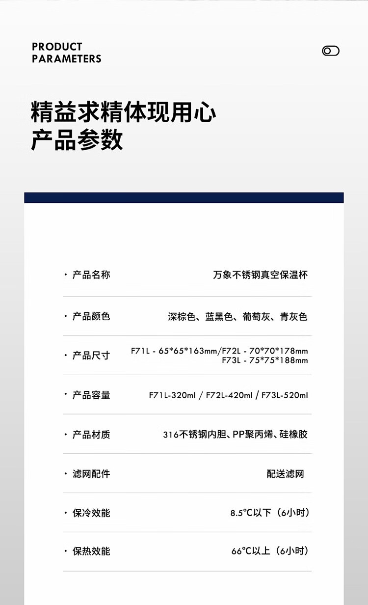 商品名称:万象 不锈钢真空保温杯 420ml F72L