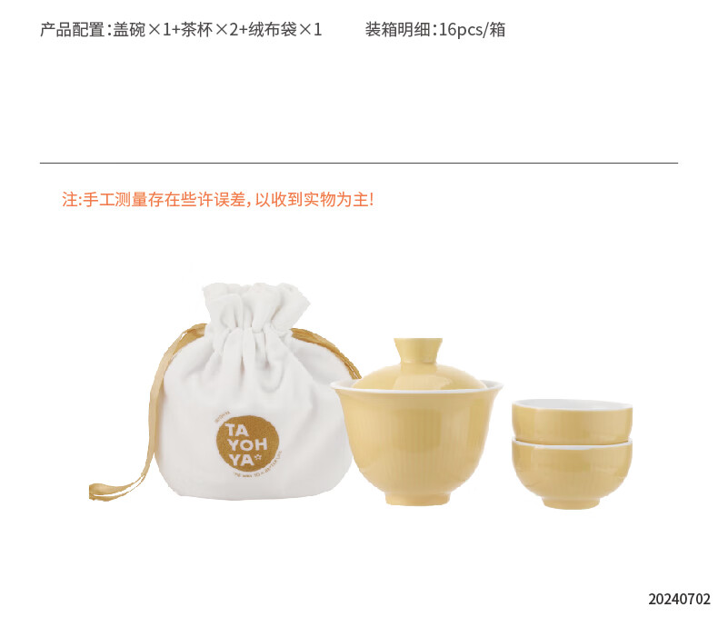 包装尺寸 :盖碗×1+茶杯×2+绒布袋×1