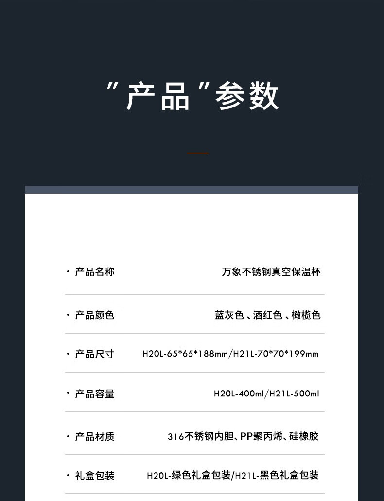 商品名称:万象 不锈钢真空保温杯 500ml H21L