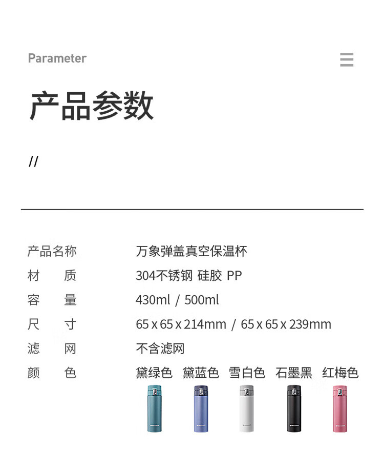 商品名称:万象 不锈钢真空保温杯 430ml B15S