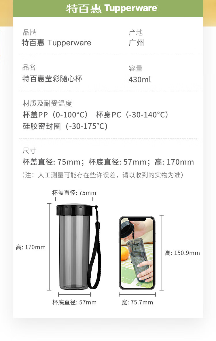 产品尺寸 :杯盖直径:75mm;杯底直径:57mm;高:170mm