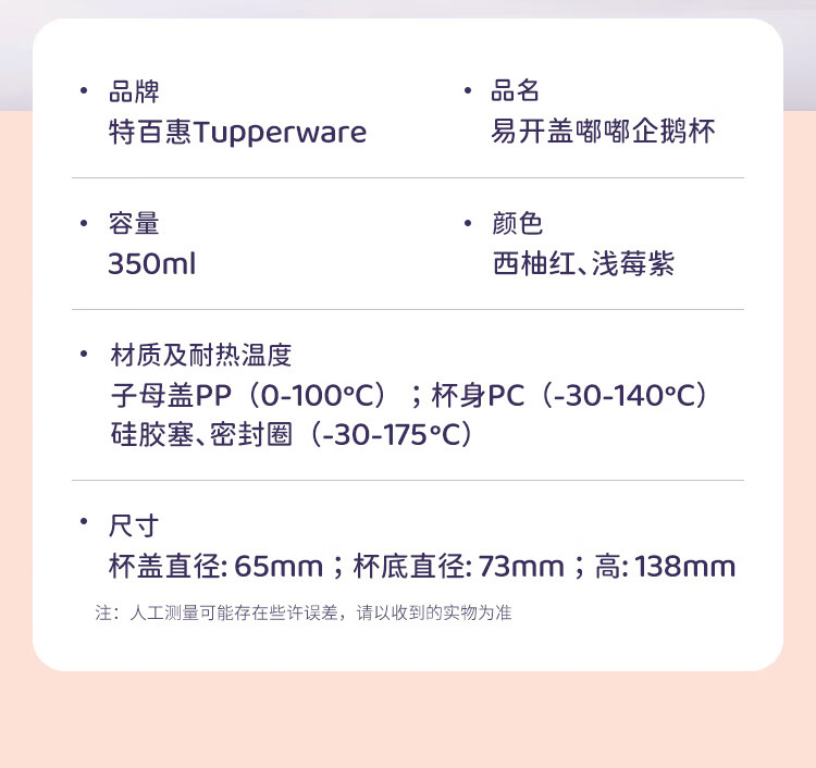 产品尺寸 :杯盖直径:65mm; 杯底直径:73mm;高:138mm