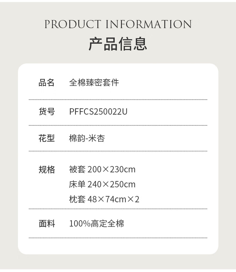 商品名称:大嘴猴 全棉臻密套件 200×230cm PFFCS250022U(棉韵-米杏)/PFFCS250023U(棉韵-奢灰)/PFFCS250024U(棉韵-雪粉)