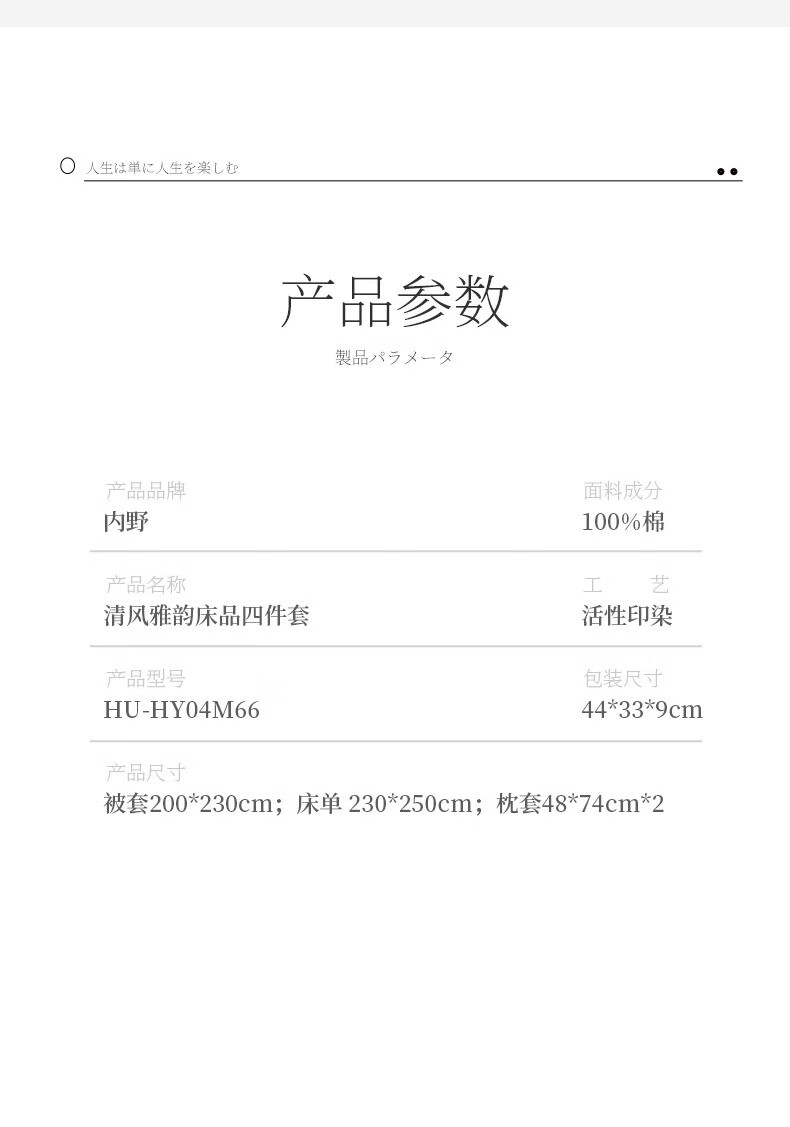 商品名称:内野 清风雅韵床品四件套 200×230cm HU-HY04M66(清风雅韵)/HU-HY04M65(花间绮梦)/HU-HY04M67(荷畔悠眠)