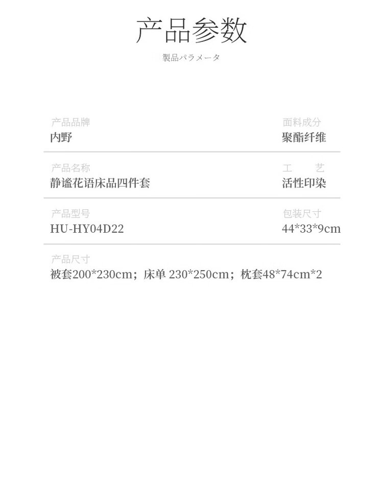 商品名称:内野 静谧花语床品四件套 200×230cm HU-HY04D22