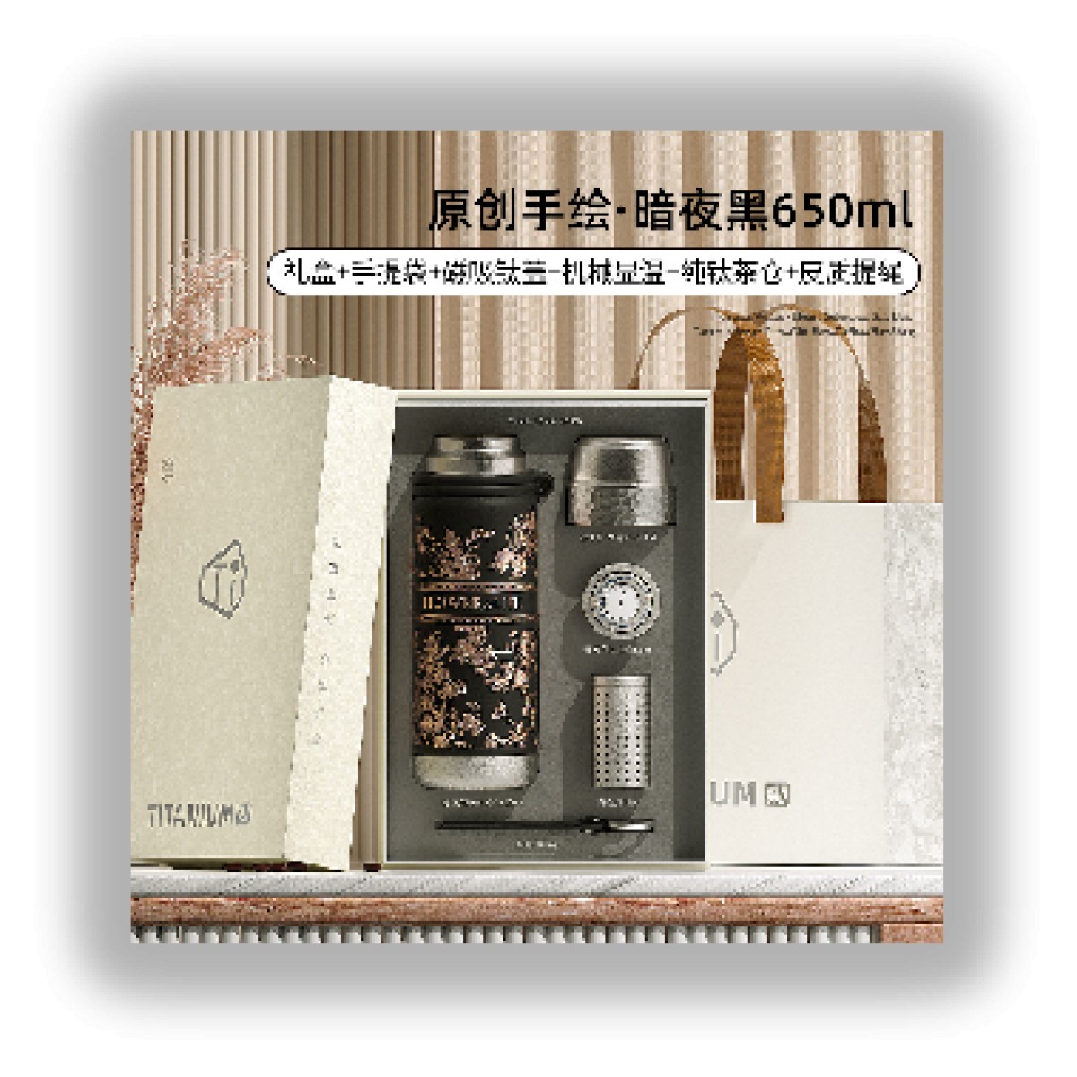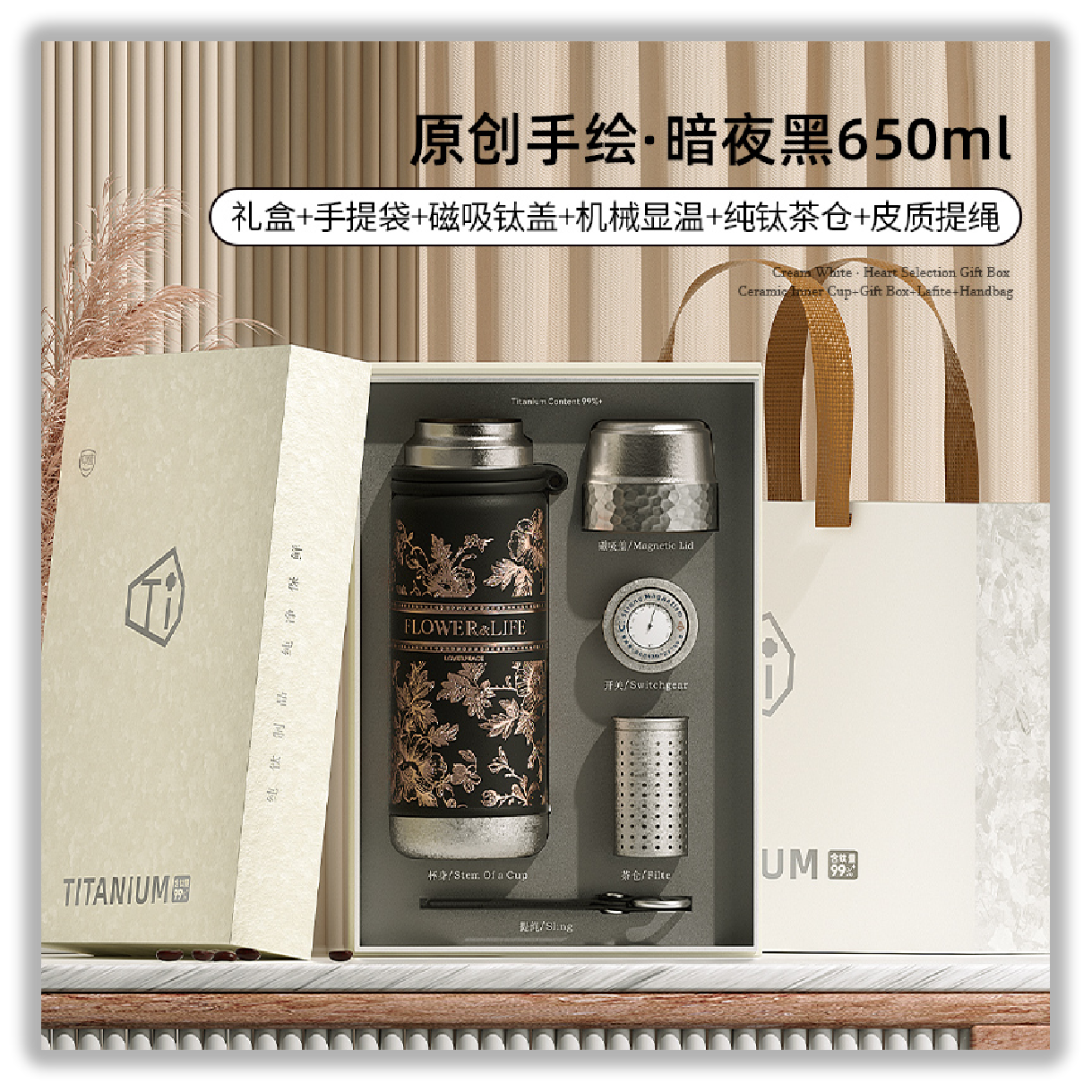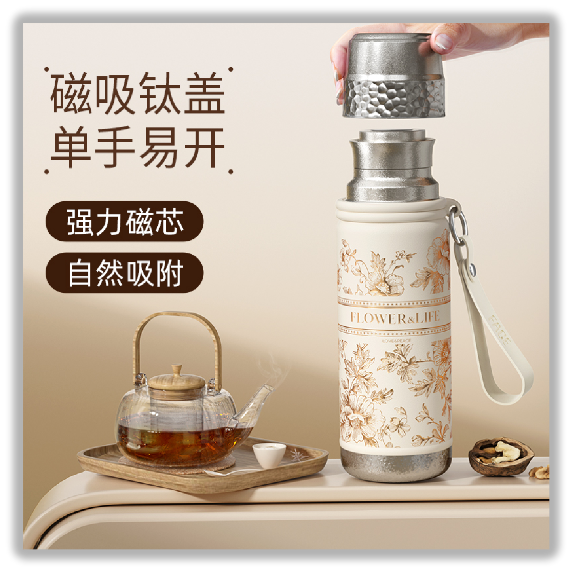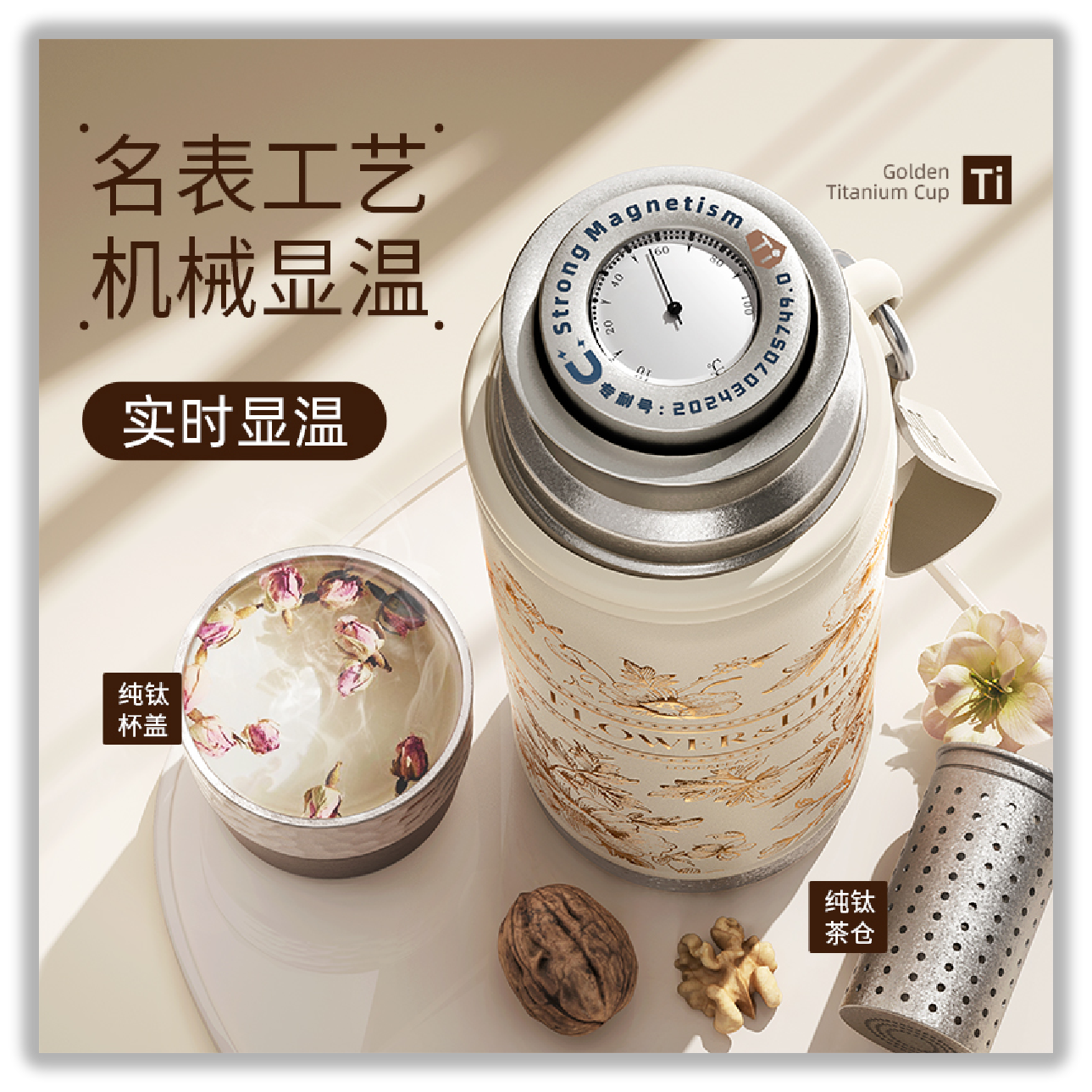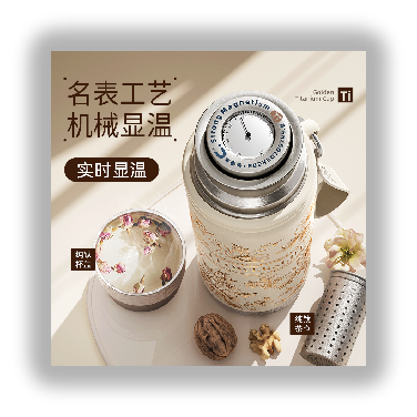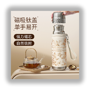 1、防坠磁吸钛盖,强力稳吸,单手易开 2、名表工艺,机械显温 3、一杯双饮,开盖直饮/杯盖倒饮 4、分离式茶仓,清洗换茶