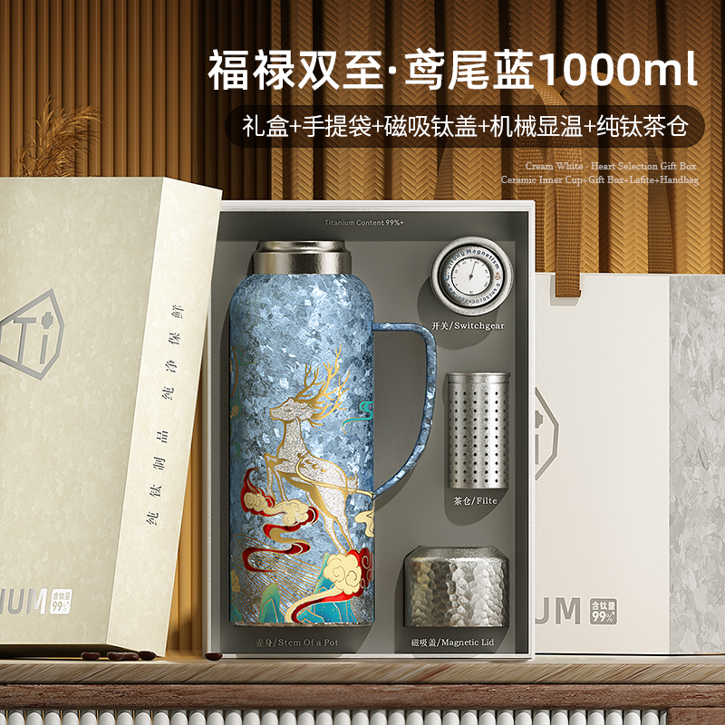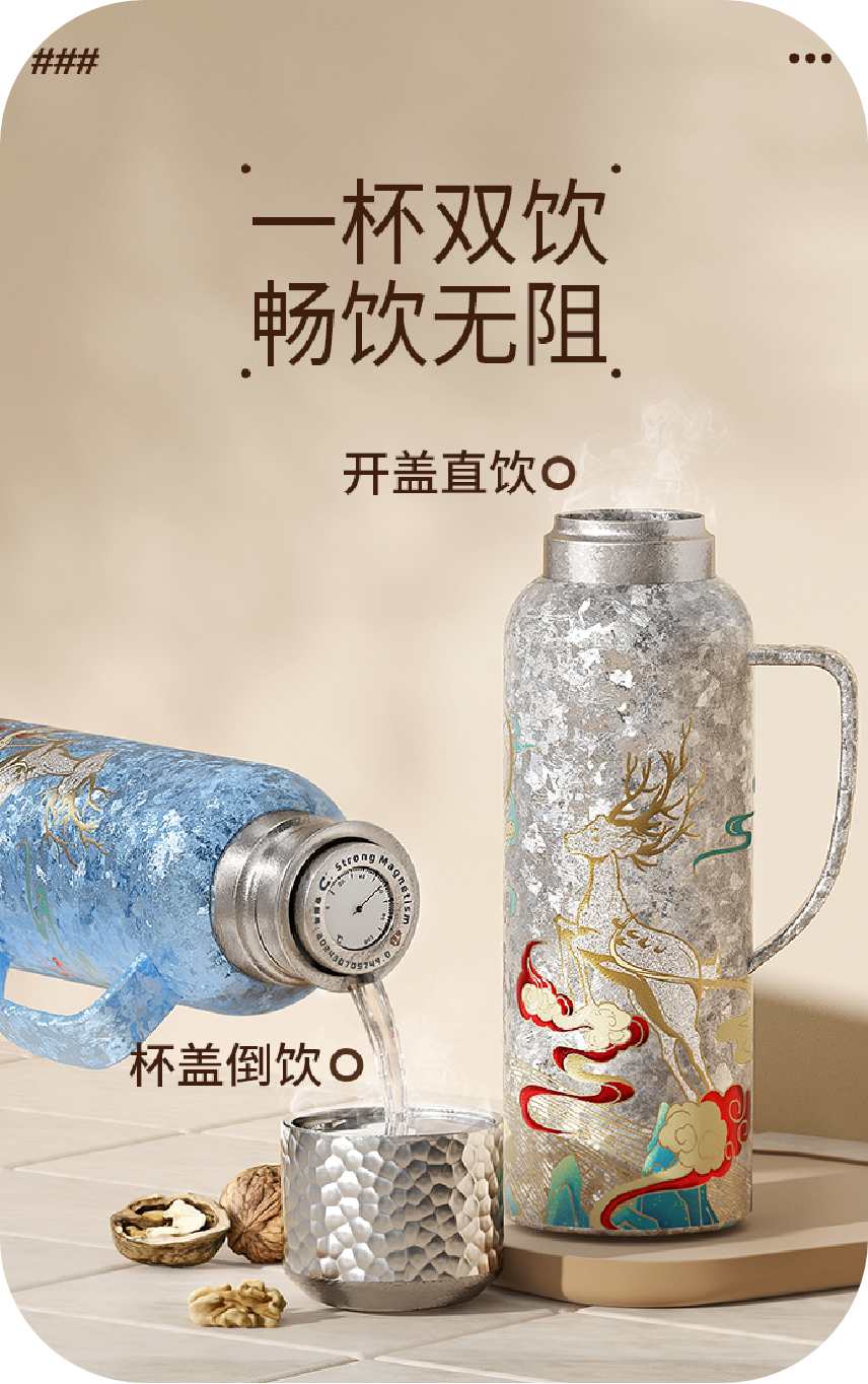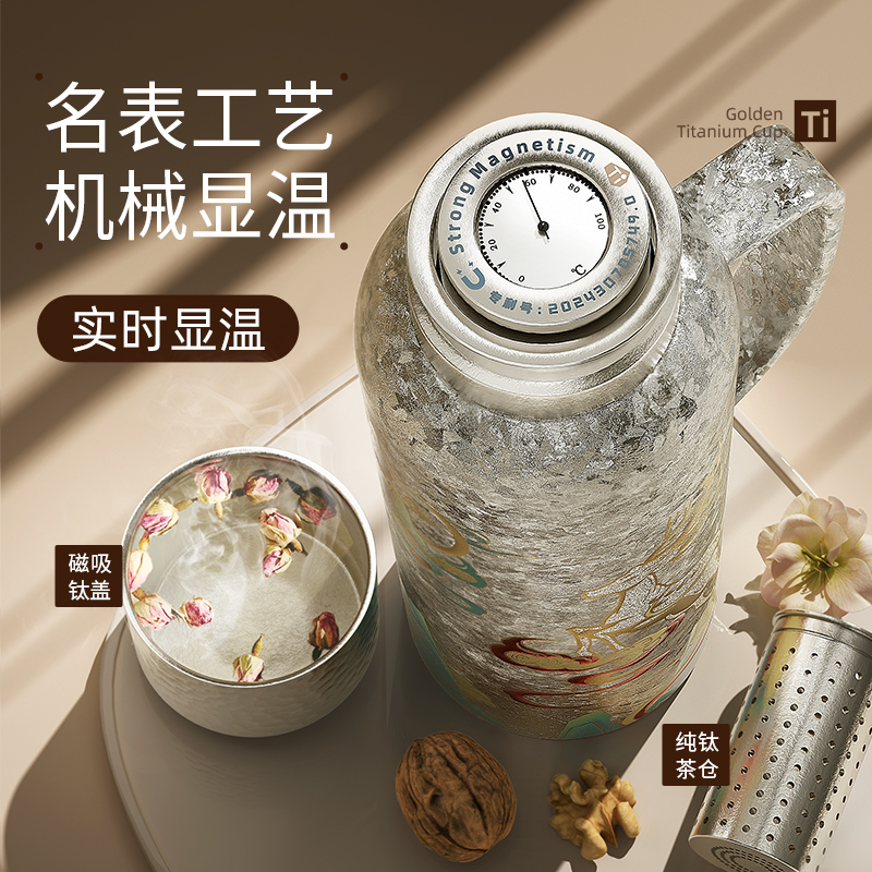 1、防坠磁吸钛盖,强力稳吸,单手易开 2、名表工艺,机械显温 3、一杯双饮