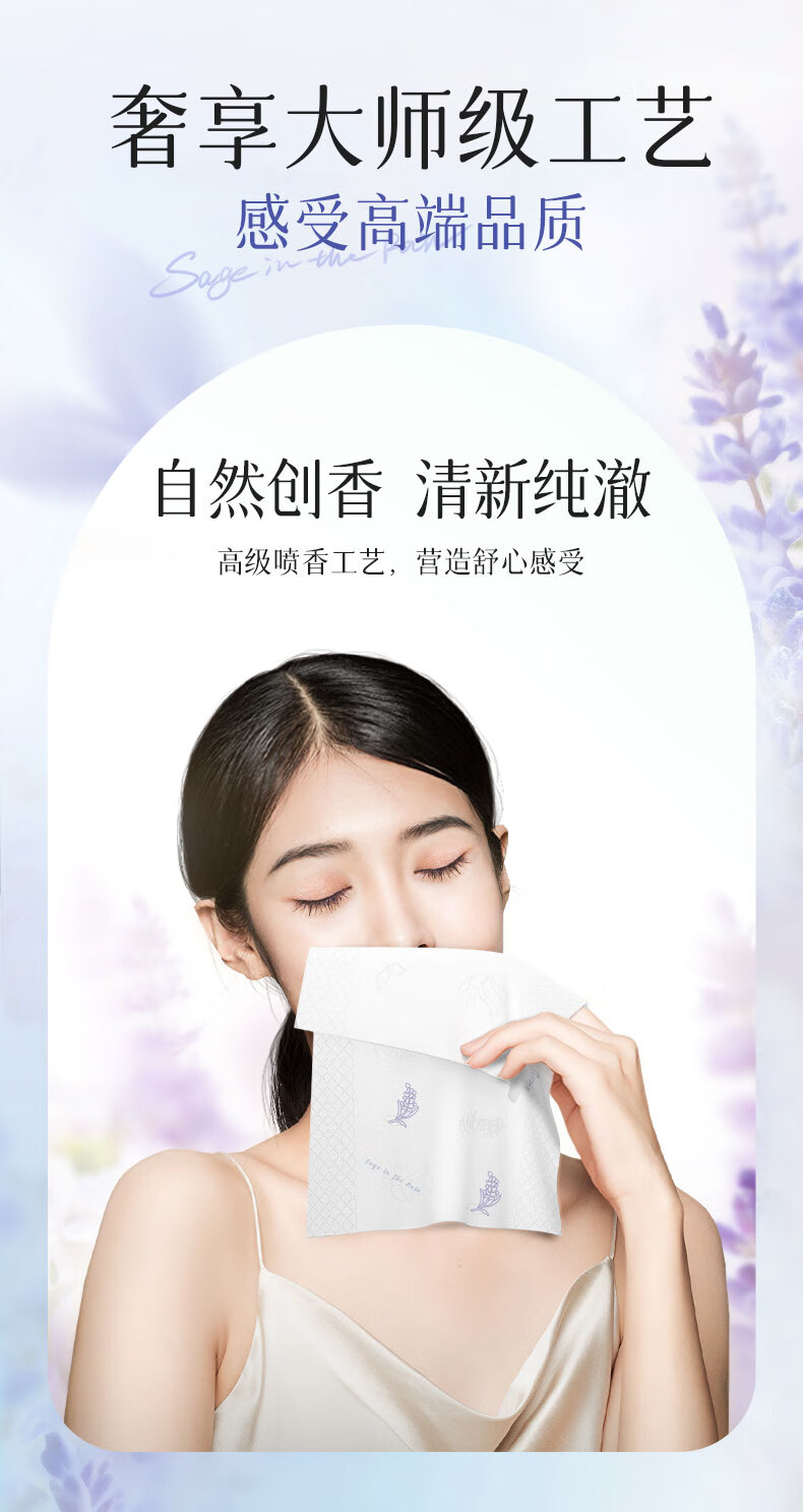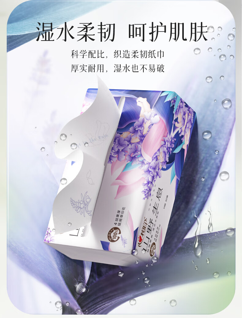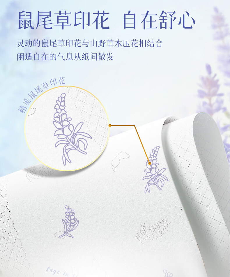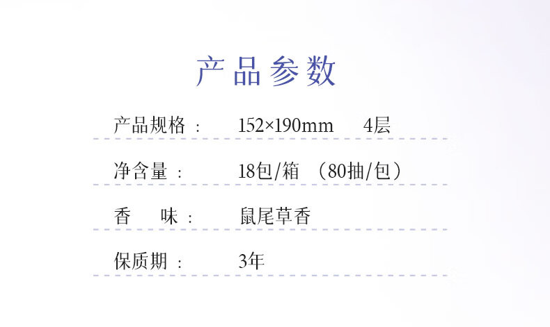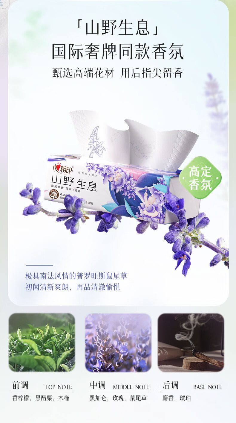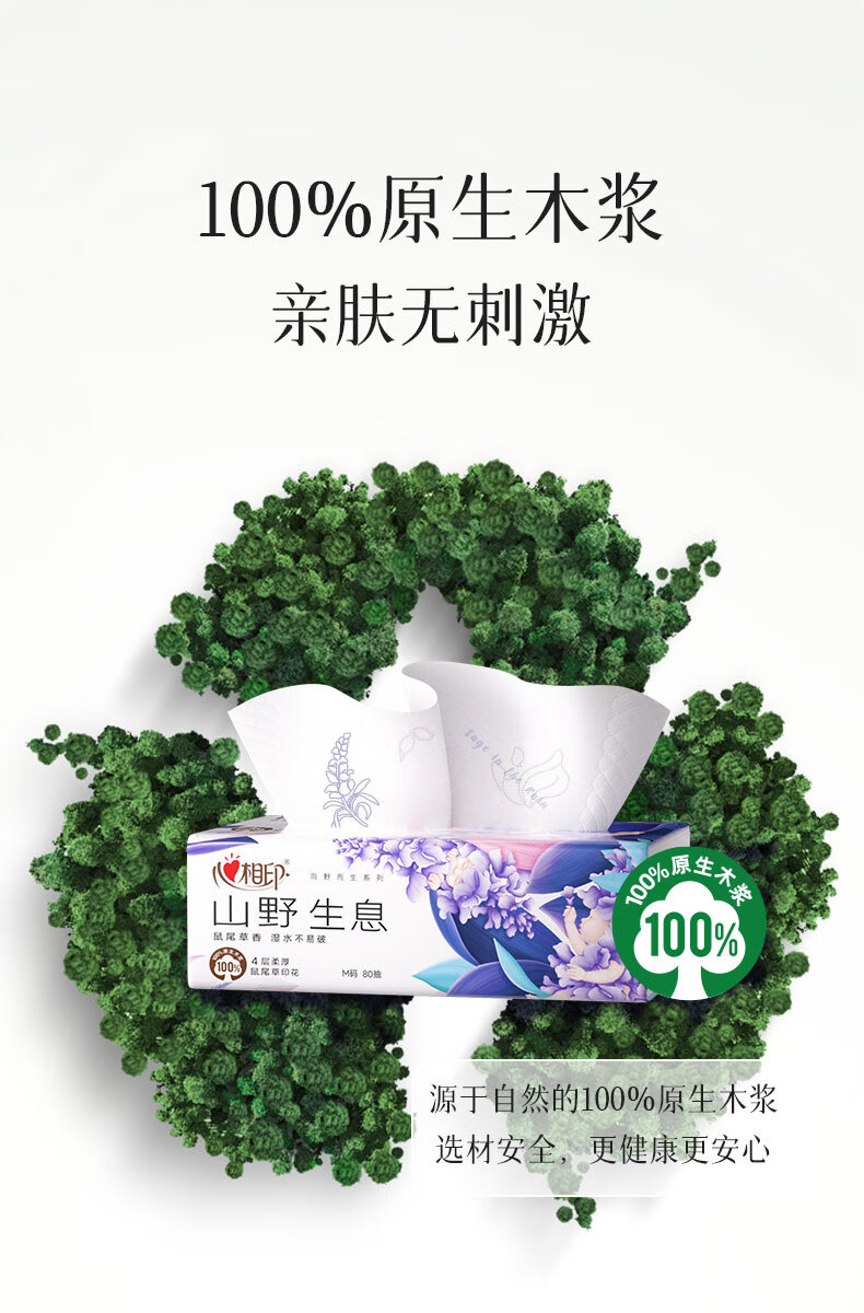 商品名称:心相印 向野而生80抽18包四层塑装面巾纸(鼠尾草印花)M码 DT42080(箱装)