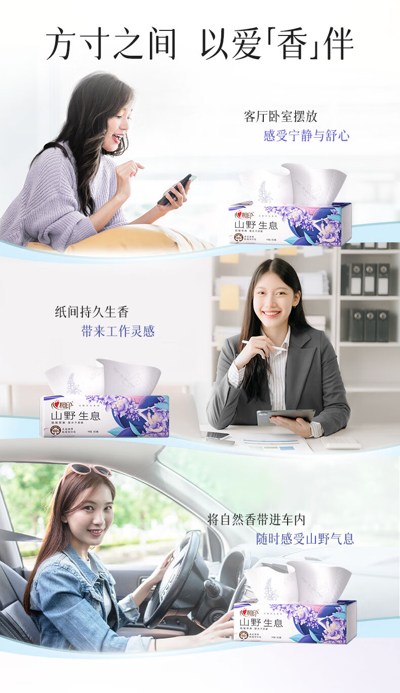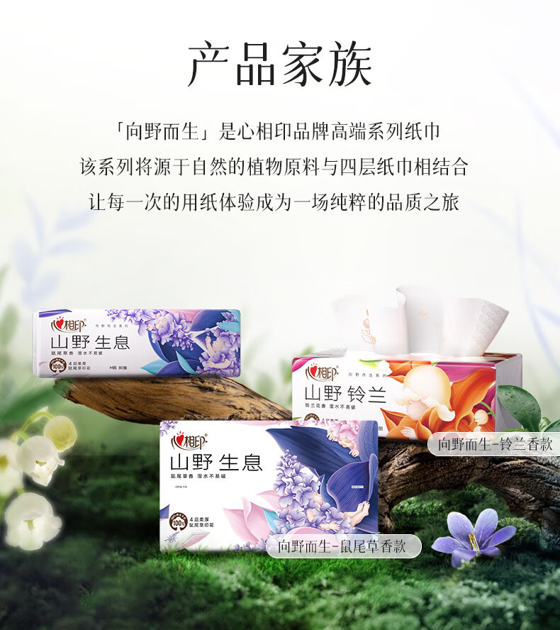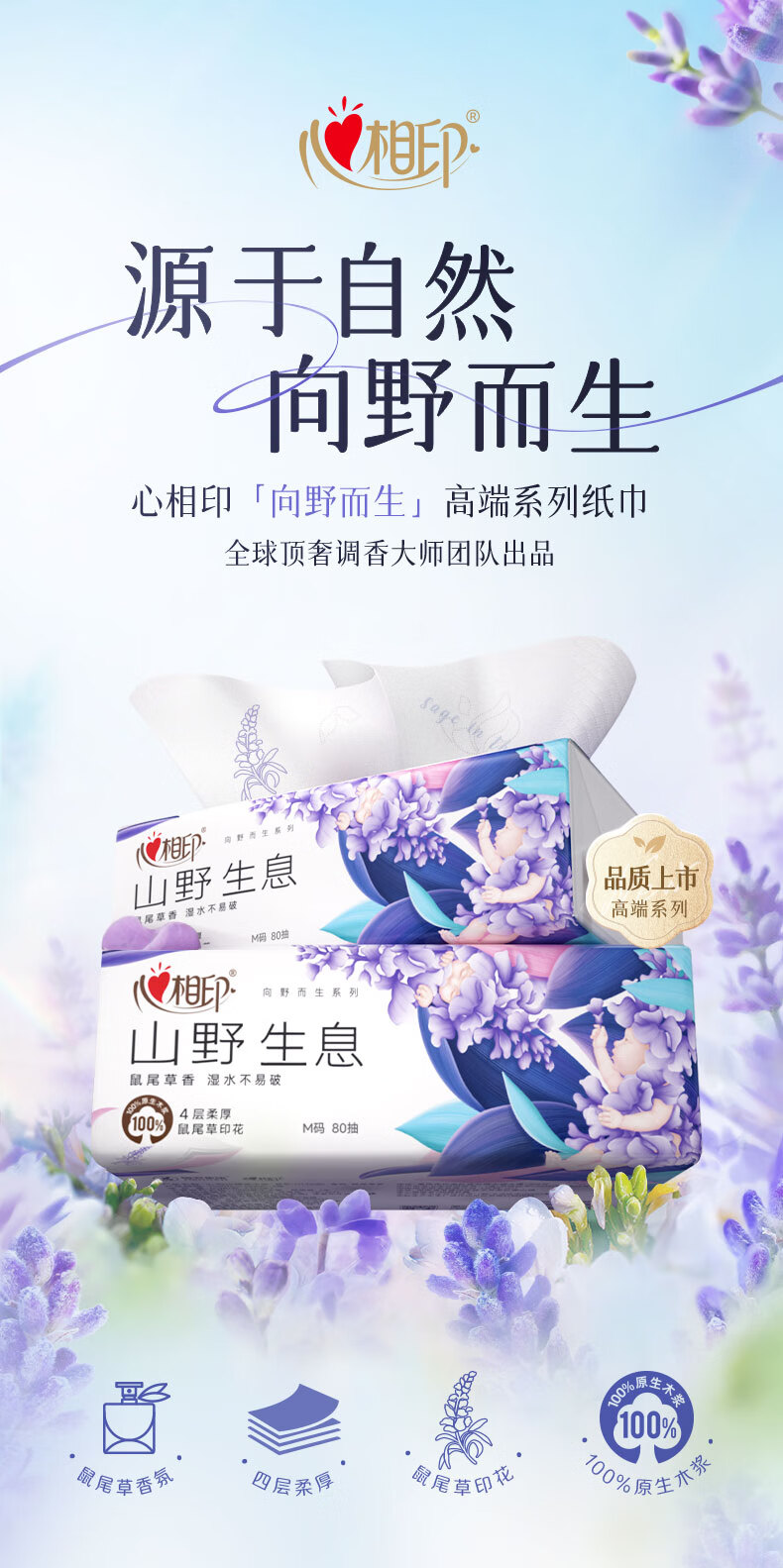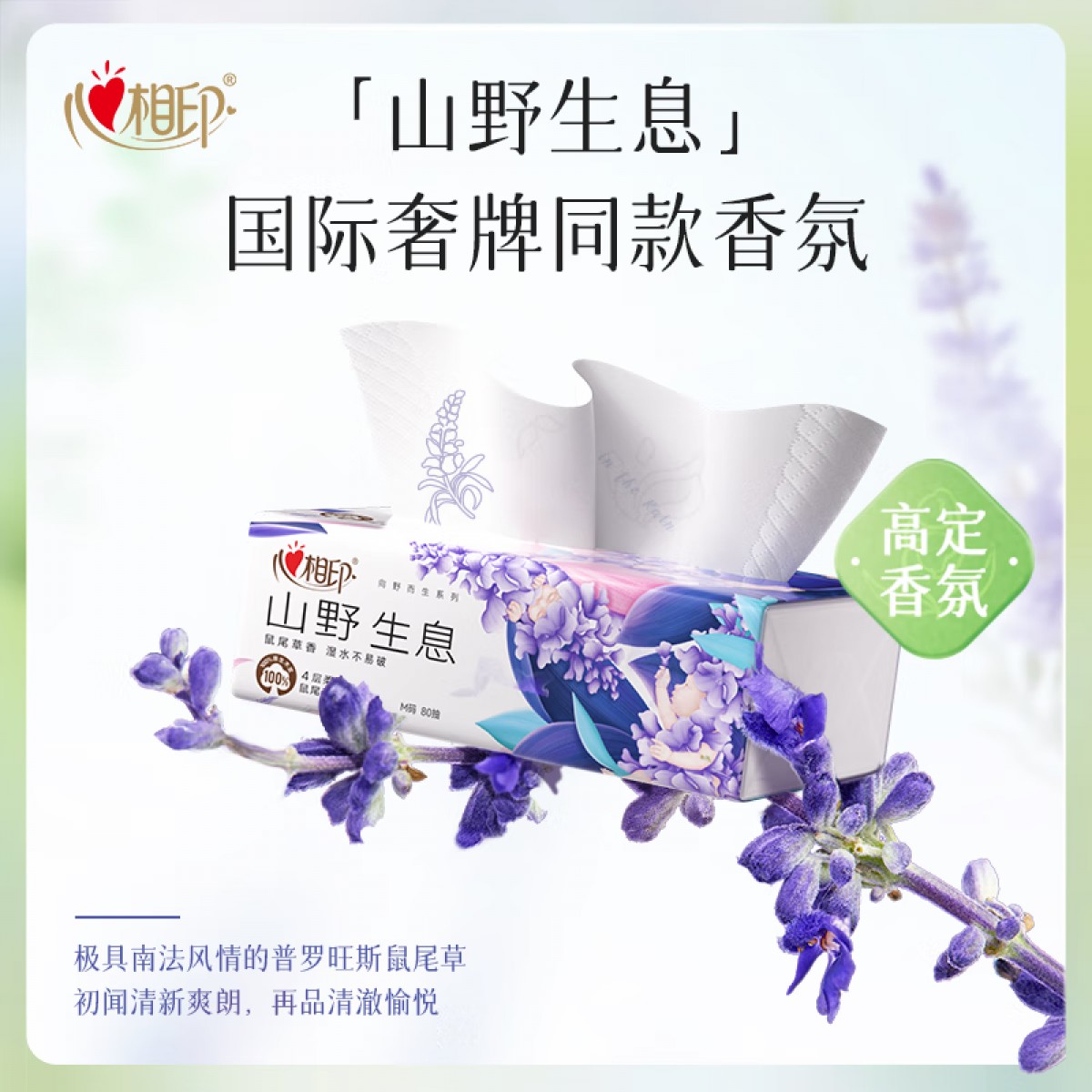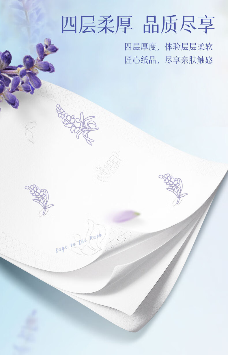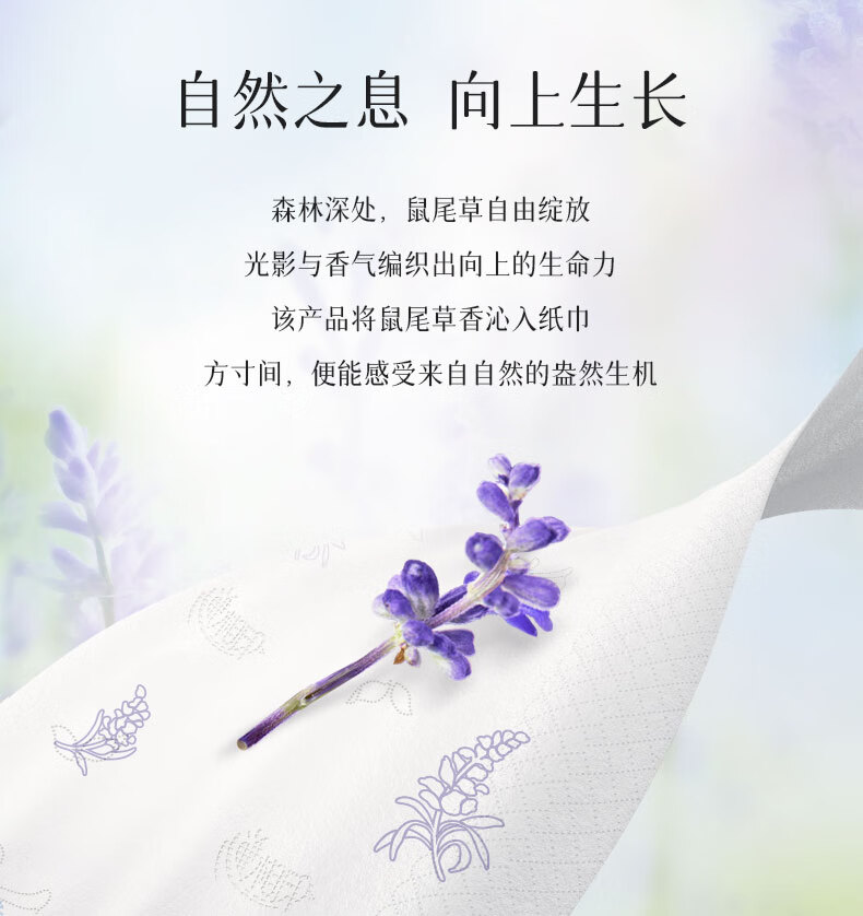 商品名称:心相印 向野而生80抽18包四层塑装面巾纸(鼠尾草印花)M码 DT42080(箱装)