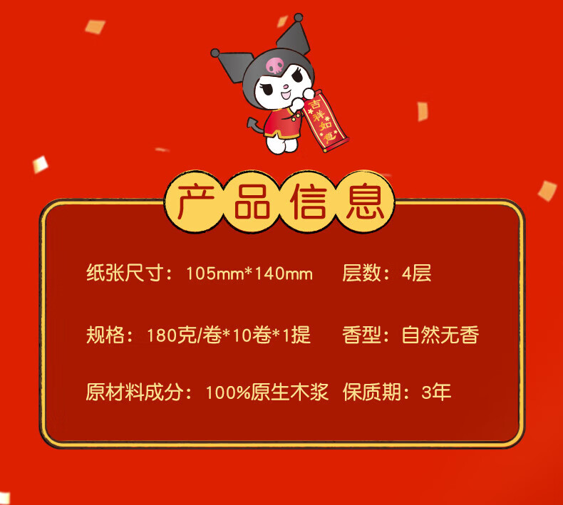 商品名称:心相印 经典180克10粒装四层卷筒卫生纸(升级版1)(新春) BT2910(单提)